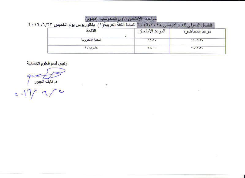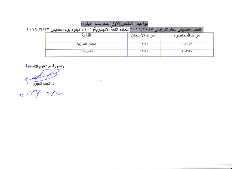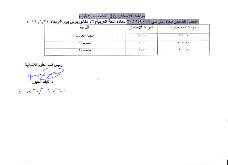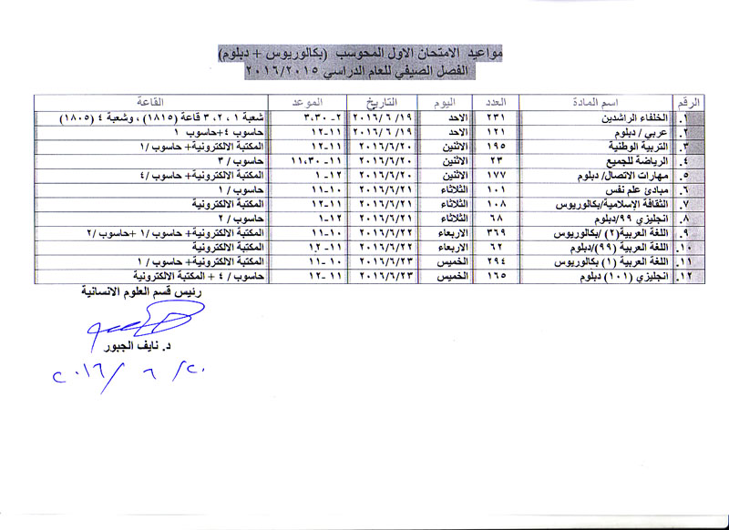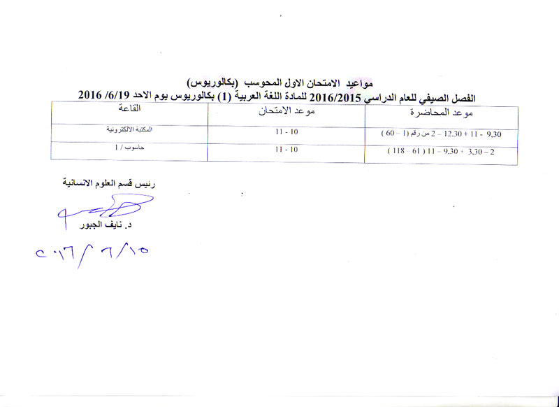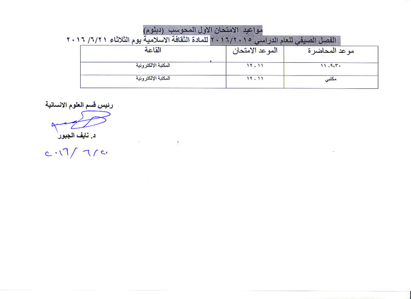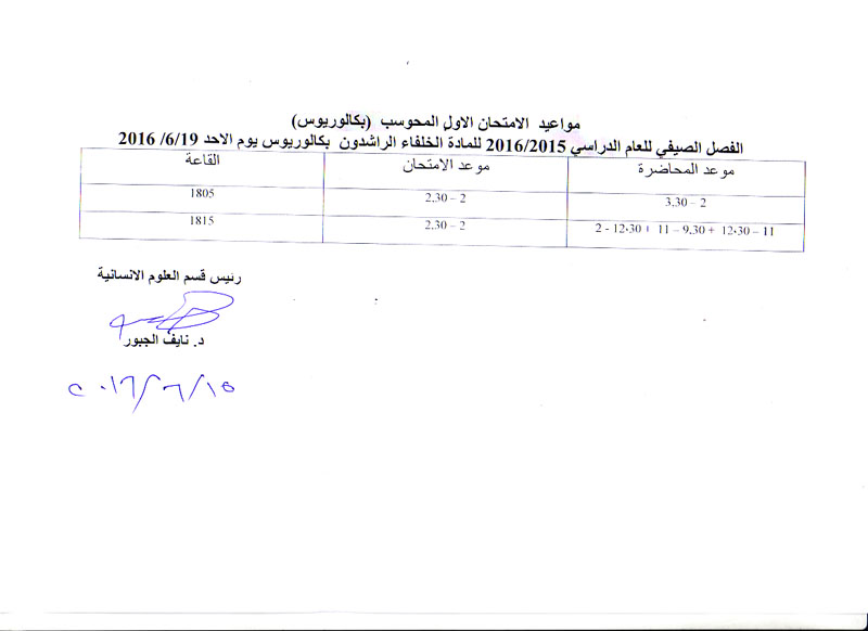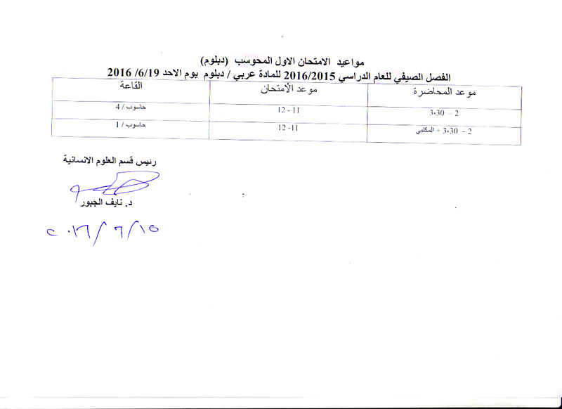 مواعيد الامتحان الاول المحوسب بكالوريوس و دبلوم قسم العلوم الانسانية للفصل الصيفي 2015-2016