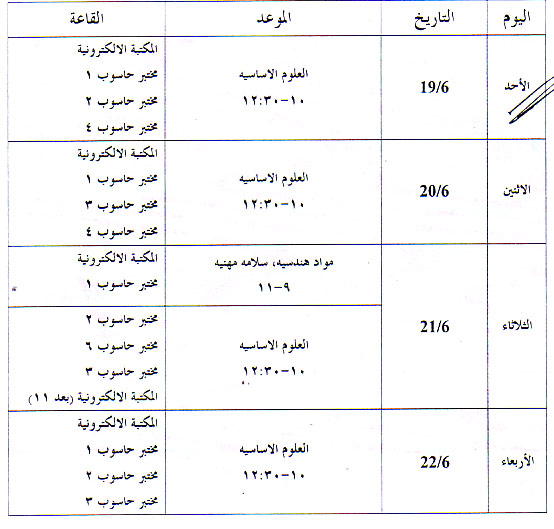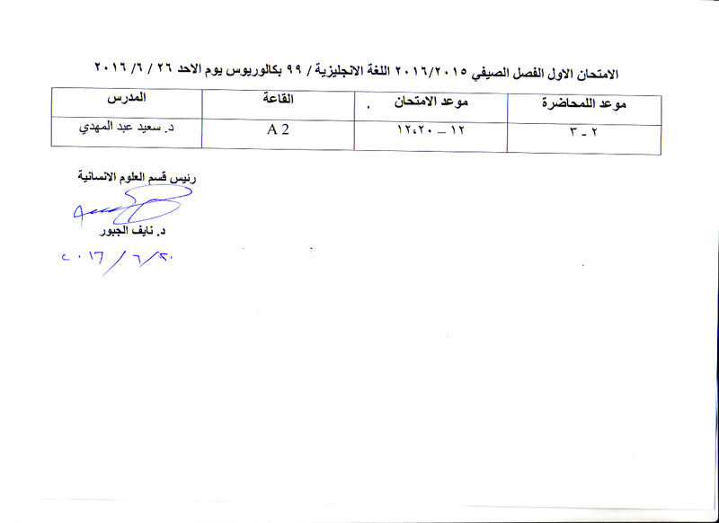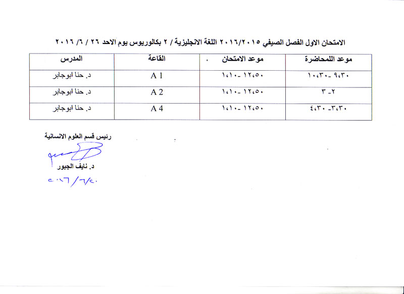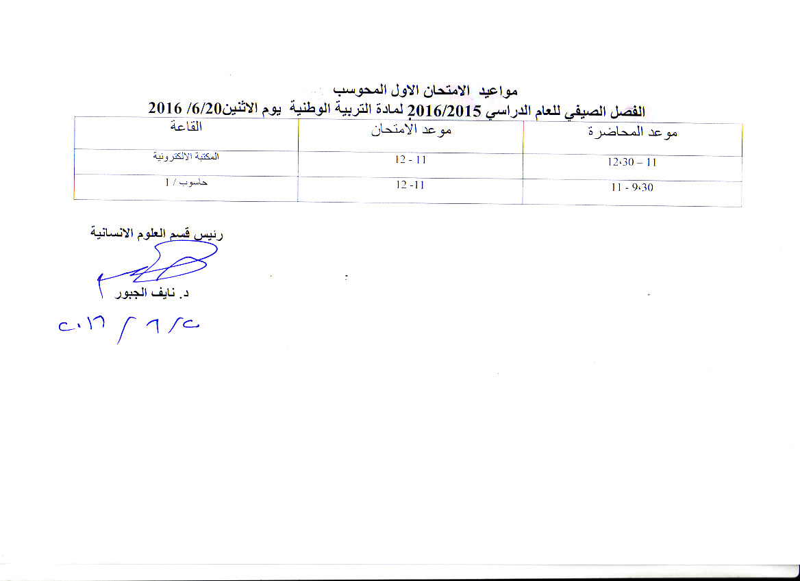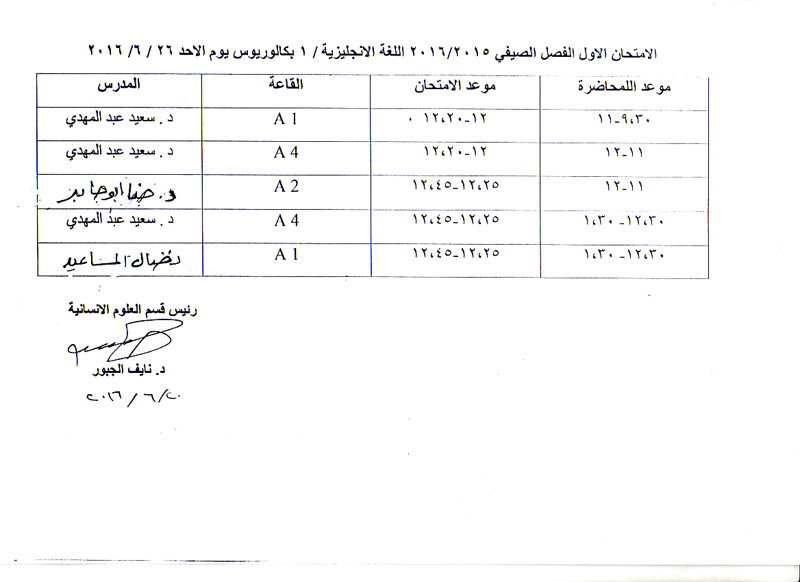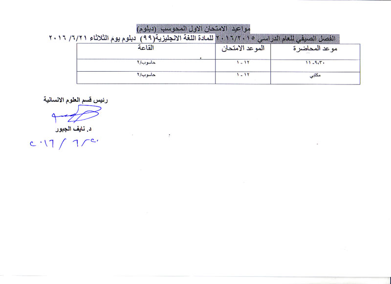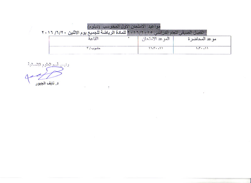مواعيد الامتحان الاول المحوسب بكالوريوس و دبلوم قسم العلوم الانسانية للفصل الصيفي 2015-2016