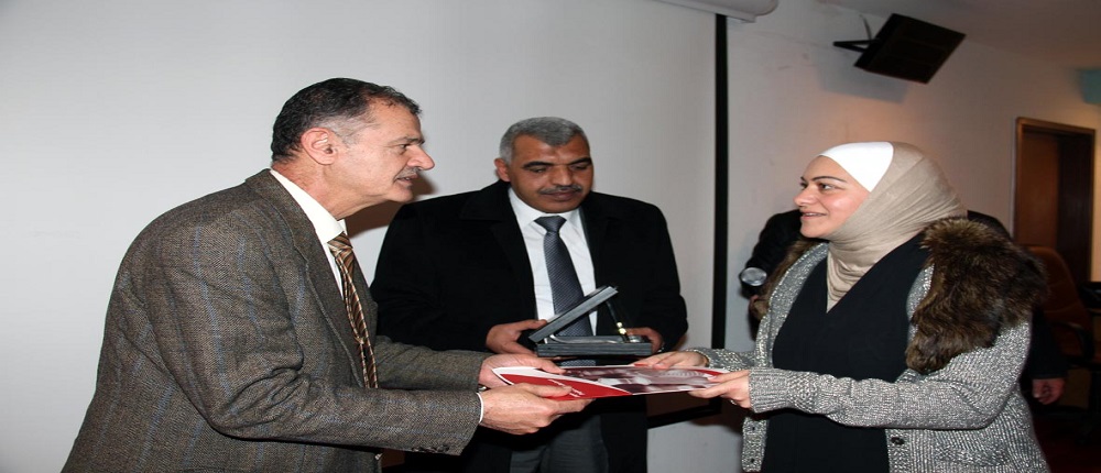 وفي نهاية اليوم العلمي قام الاستاذ الدكتور محمد حياصات بتسليم درع الجامعة الى كل من المهندس اسد جموخة والاستاذة رانيا الخواجا والمهندس فادي العلي تقدير لهم على مشاركتهم في انجاح فعاليات اليوم العلمي لكلية الاعمال في الحامعة.