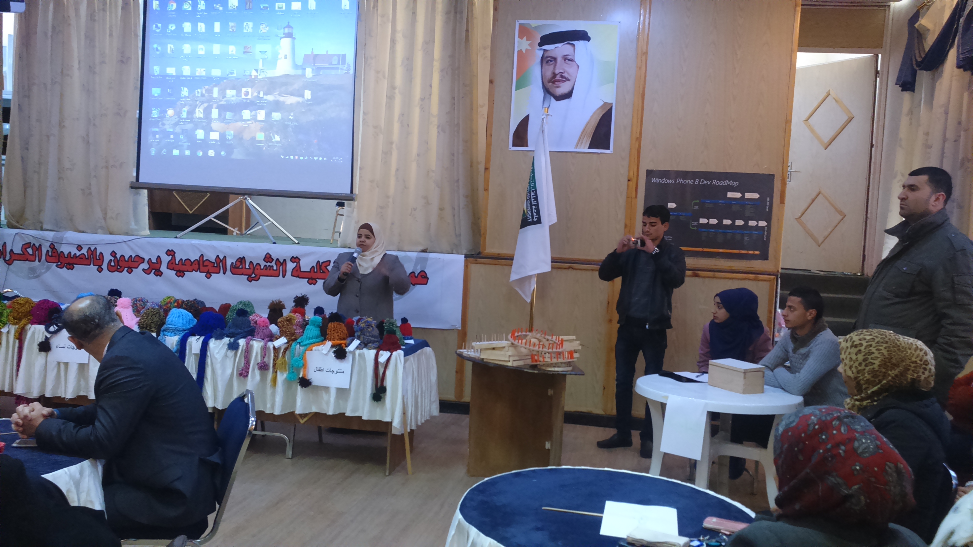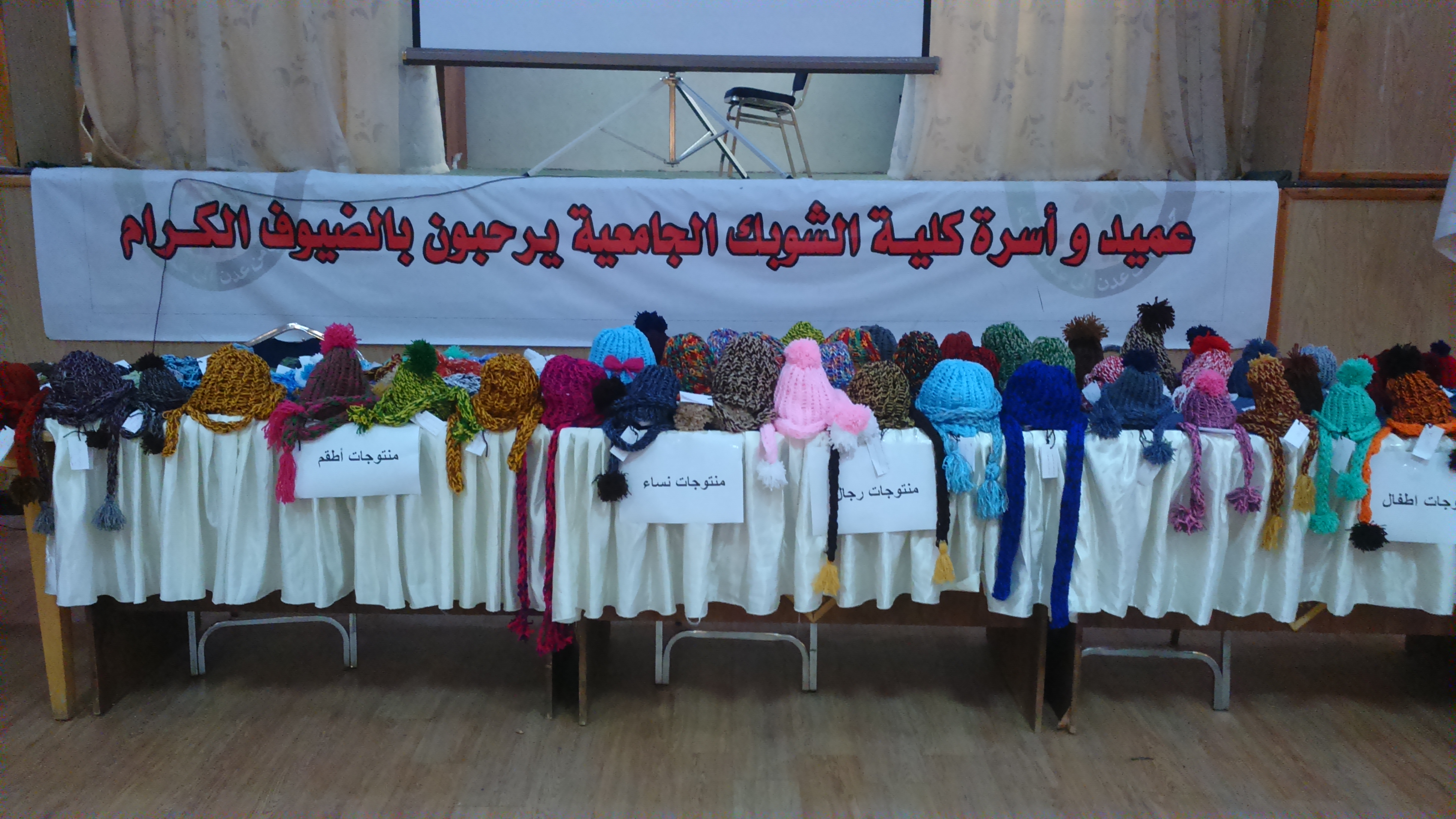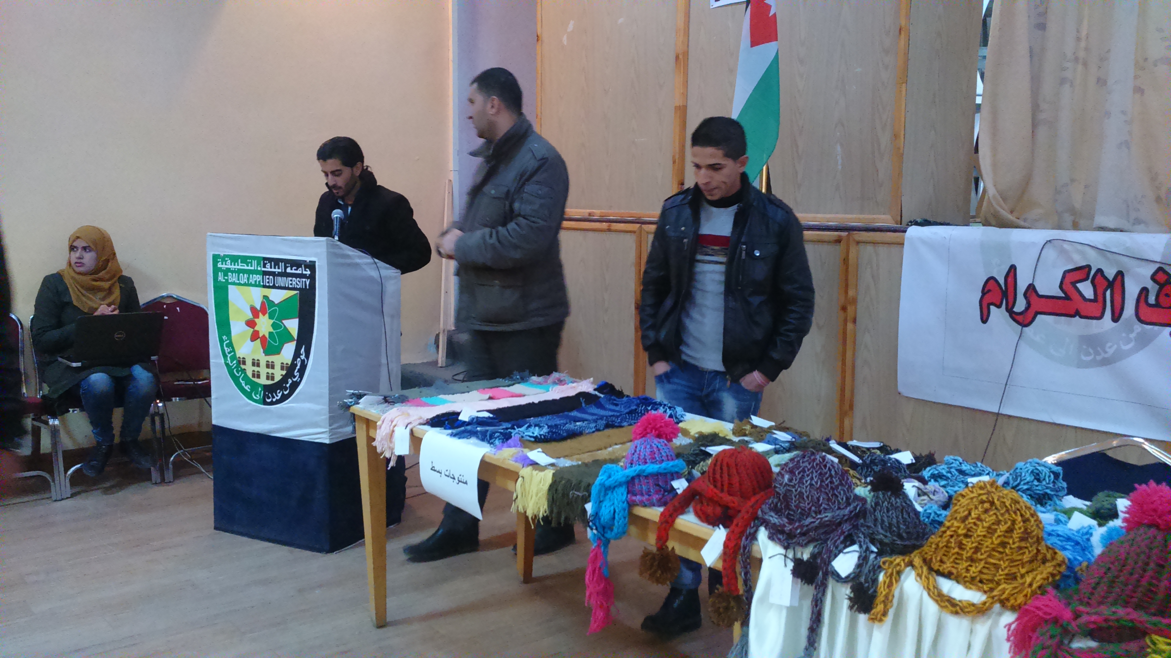 رعى عميد كلية الشوبك الجامعية الدكتور/ عودة مراد وأعضاء الهيئتين التدريسية والإدارية البازار الذي نفذه طلبة مساق المنسوجات/عملي باشراف مدرس المساق الدكتور/ عمر محاسنة، يوم الأربعاء 21/12/2016 ، حيث تم إنتاج المشغولات البالغ عددها (45) طاقية و(55) لفحة، وبعض المشغولات الأخرى، وقام الطلبة بإقامة البازار لبيع هذه القطع بحيث أن مردود بيع القطع سيعود على مشغل المنسوجات لشراء المواد الأولية في الفصول القادمة، وقد تم بيع جميع القطع بالمزاد العلني لجميع الحضور من طلبة الكلية والموظفين وبعض الحضور من المجتمع المحلي.