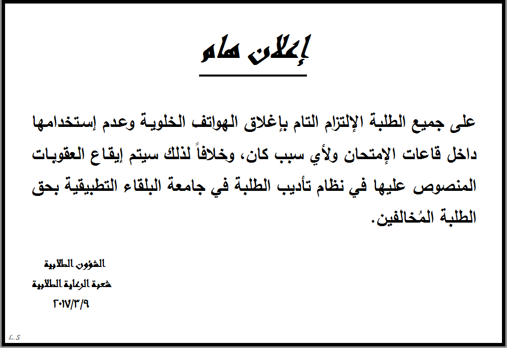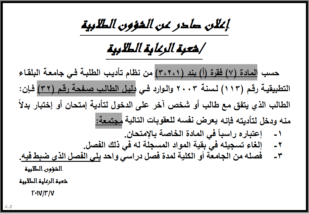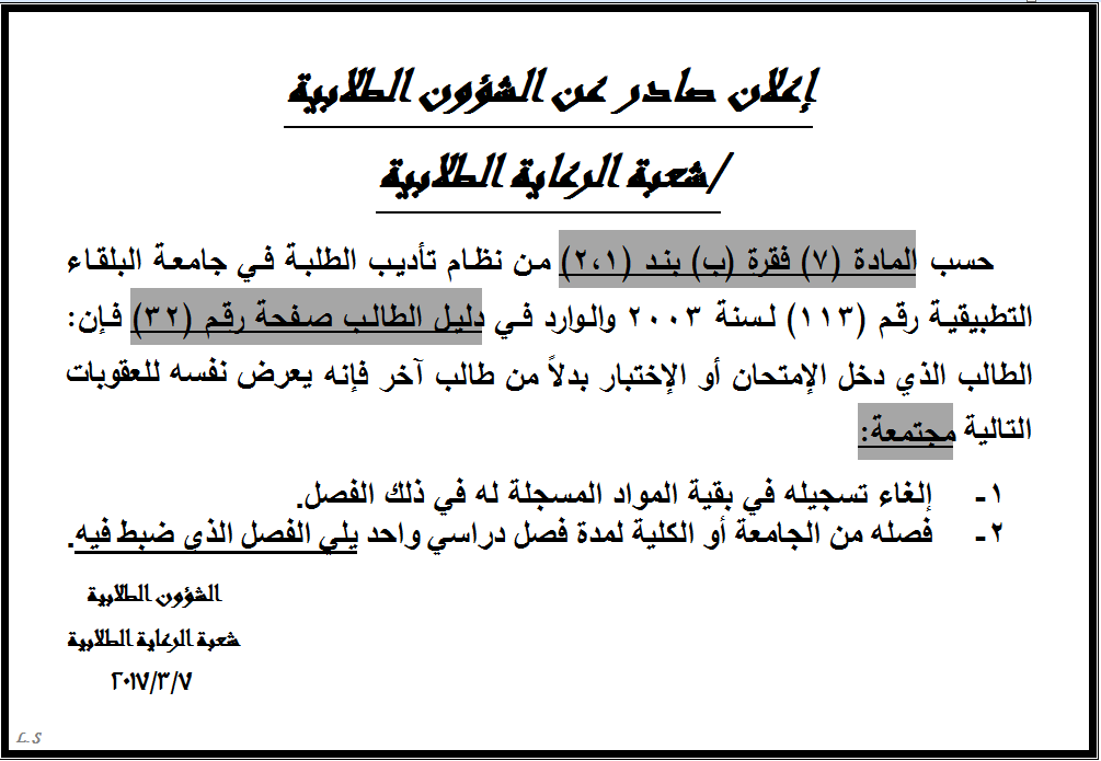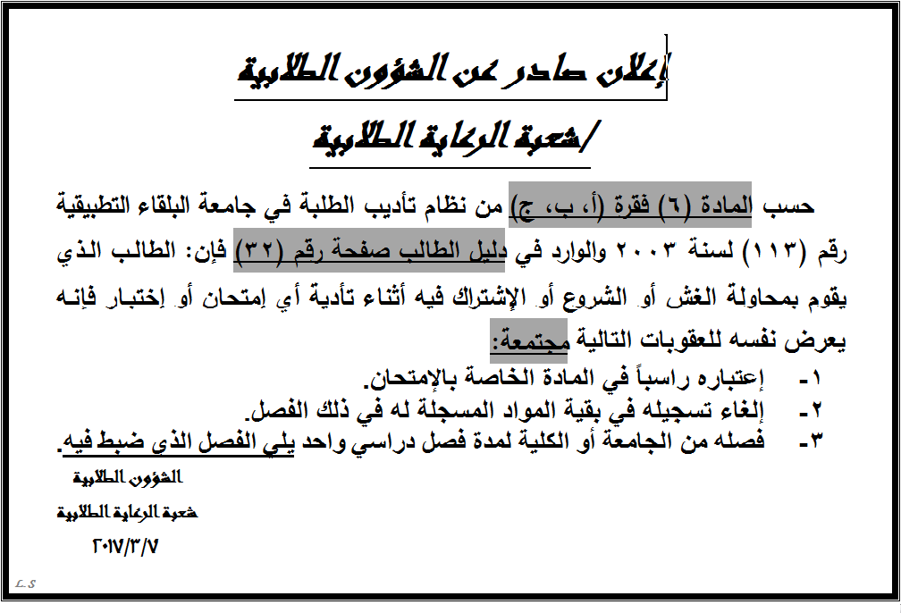 إعــلان هــام لطلبة جامعة البلقاء التطبيقية بواسطة