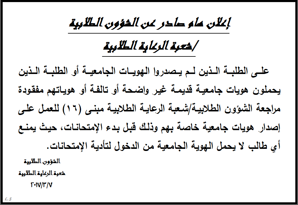 اعلانات هامة صادرة عن قسم الشؤون الطلابية