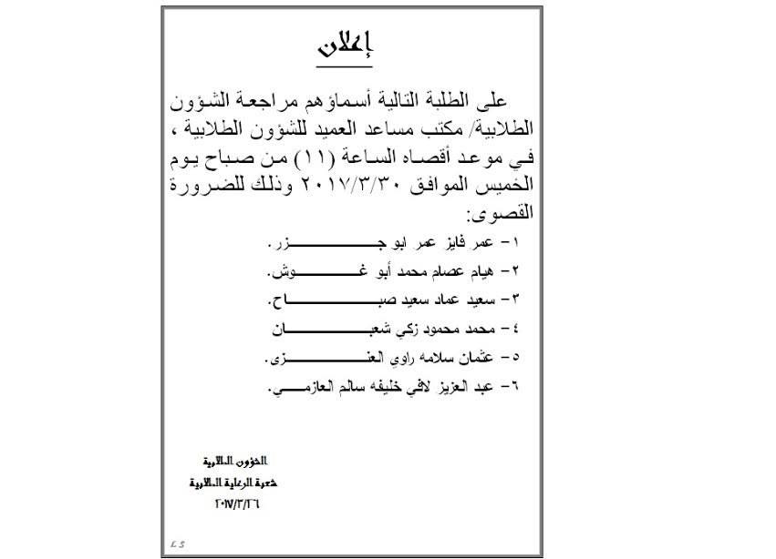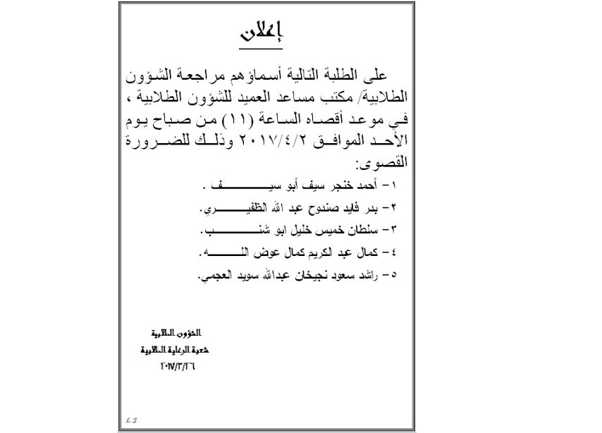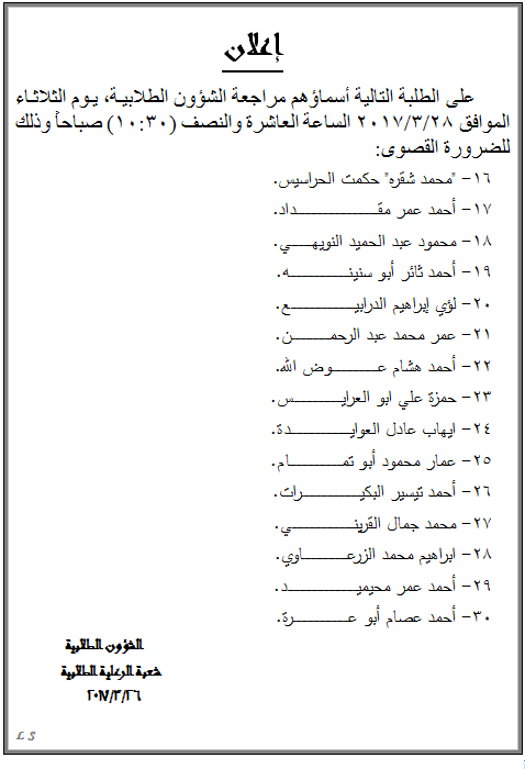 اعلانات هامة صادرة عن الشؤون الطلابية