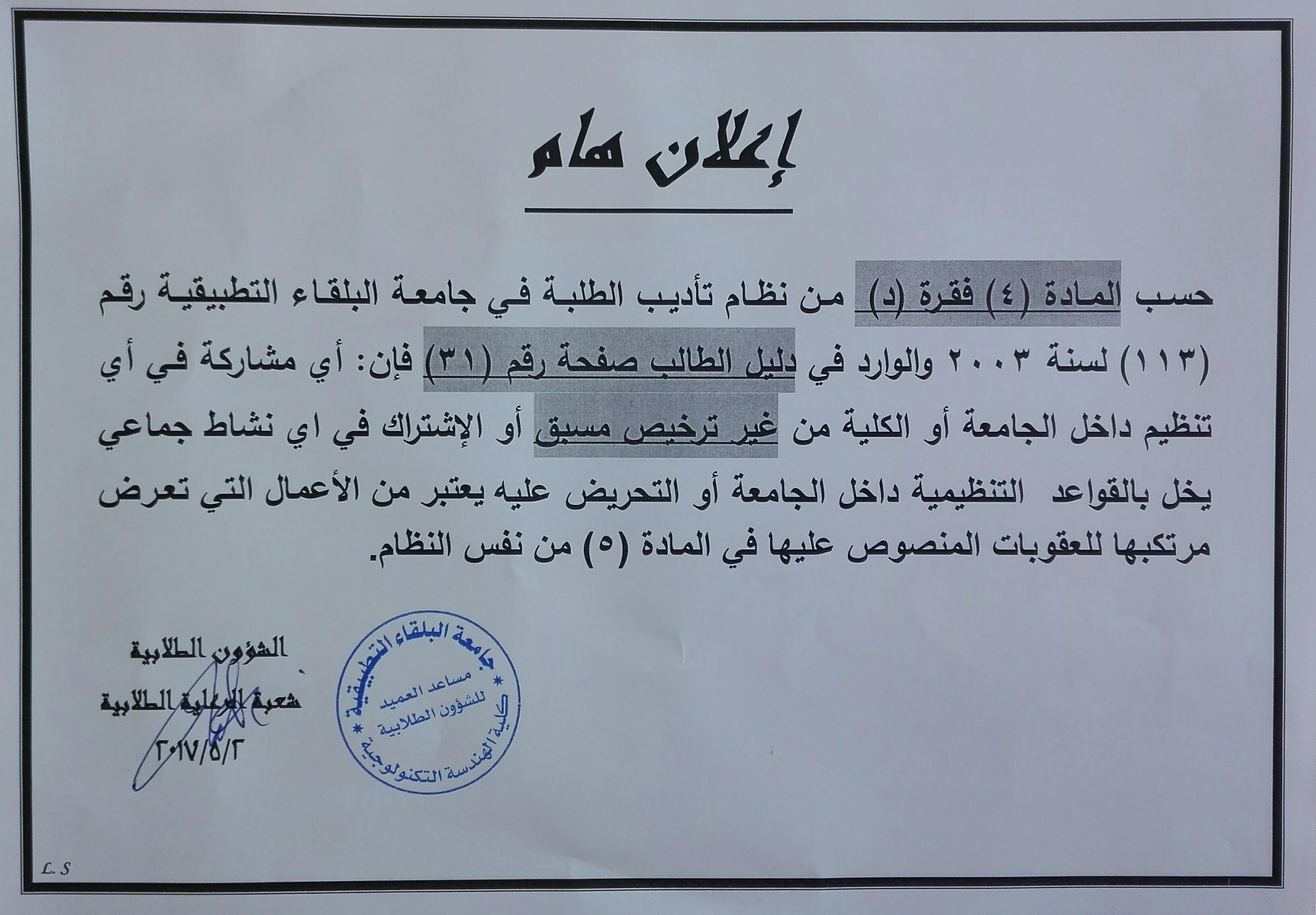 إعــلان هــام لطلبة جامعة البلقاء التطبيقية بواسطة