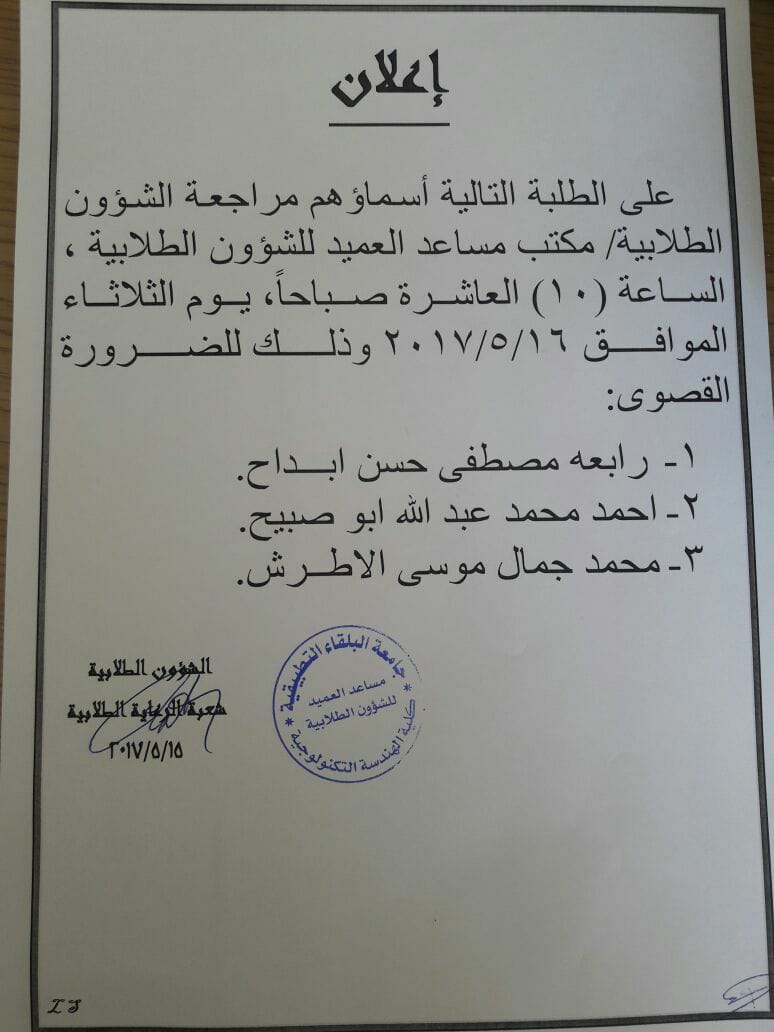 إعــلان هــام لطلبة جامعة البلقاء التطبيقية بواسطة
