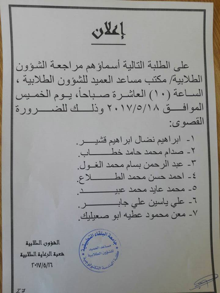 إعــلان هــام لطلبة جامعة البلقاء التطبيقية بواسطة