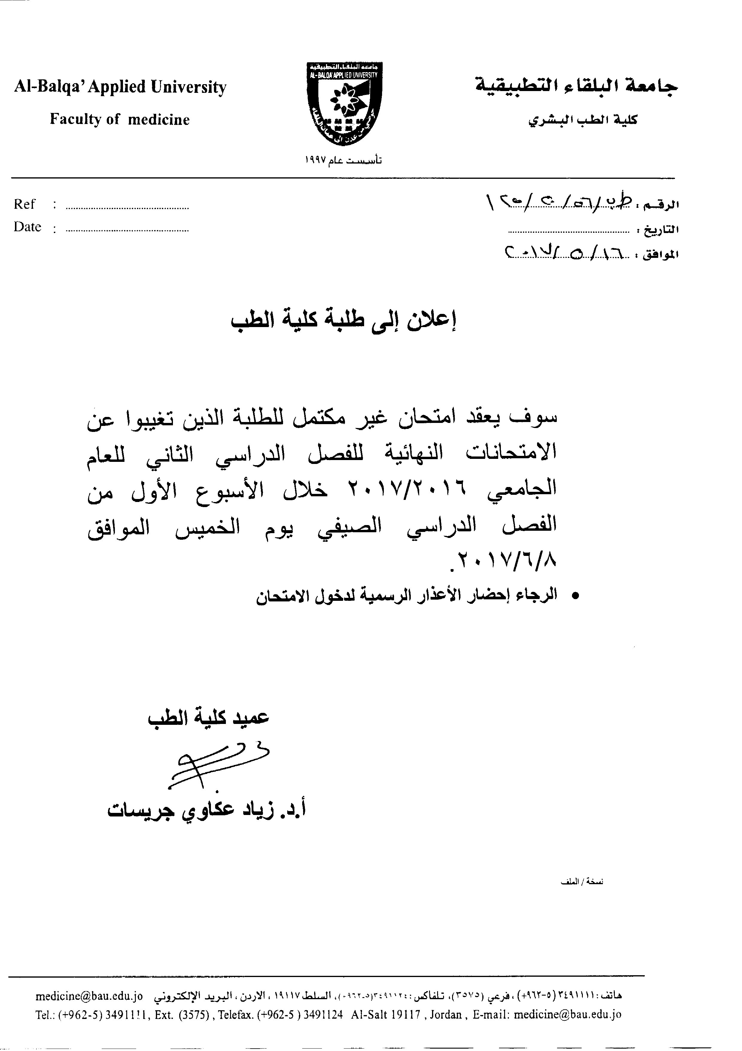 سوف يعقد امتحان غير مكتمل للطلبة الذين تغيبوا عن الامتحانات النهائية للفصل الدراسي الثاني للعام الجامعي 2016 / 2017 خلال الاسبوع الاول من الفصل الدراسي الصيفي يوم الخميس الموافق 8 / 6 / 2017