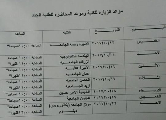على جمبع طلبة المكرمه الملكيه الساميه / مكرمة الجيش للطلبه الجدد ( لمرحلة البكالوريوس والدبلوم) في جامعة البلقاء التطبيقيه حضور الاجتماع الذي سيعقد في الكليات وحسب الكشف المرفق وذلك لأمور تتعلق ببعثاتهم وتسليم الاتفاقيات الدراسيه الحضور اجباري للجميع وكل من يتخلف عن الحضور سوف يفقد حقه بالبعثه .