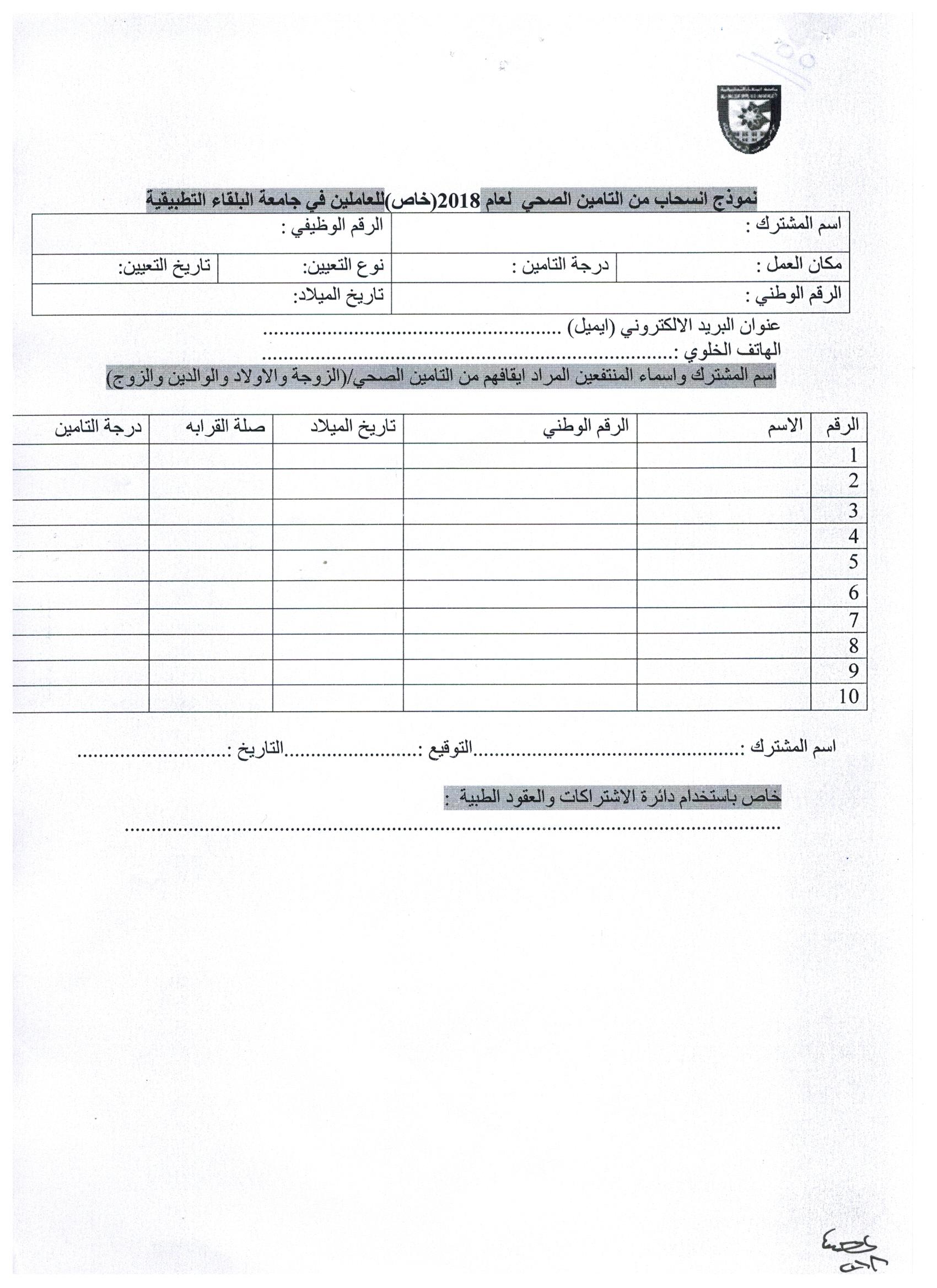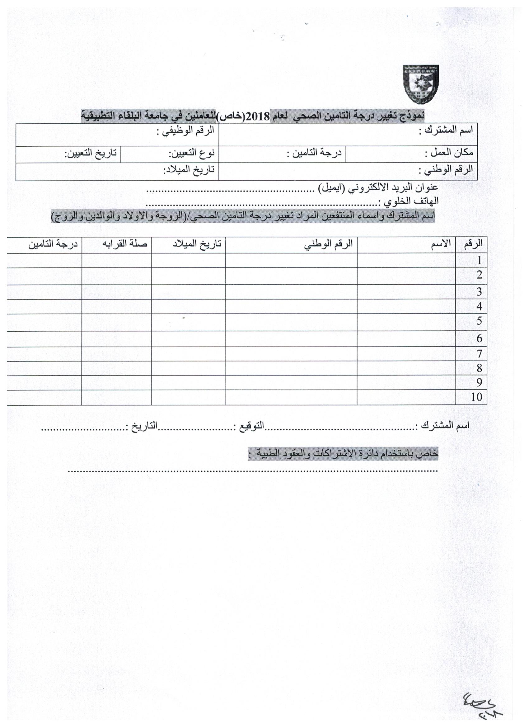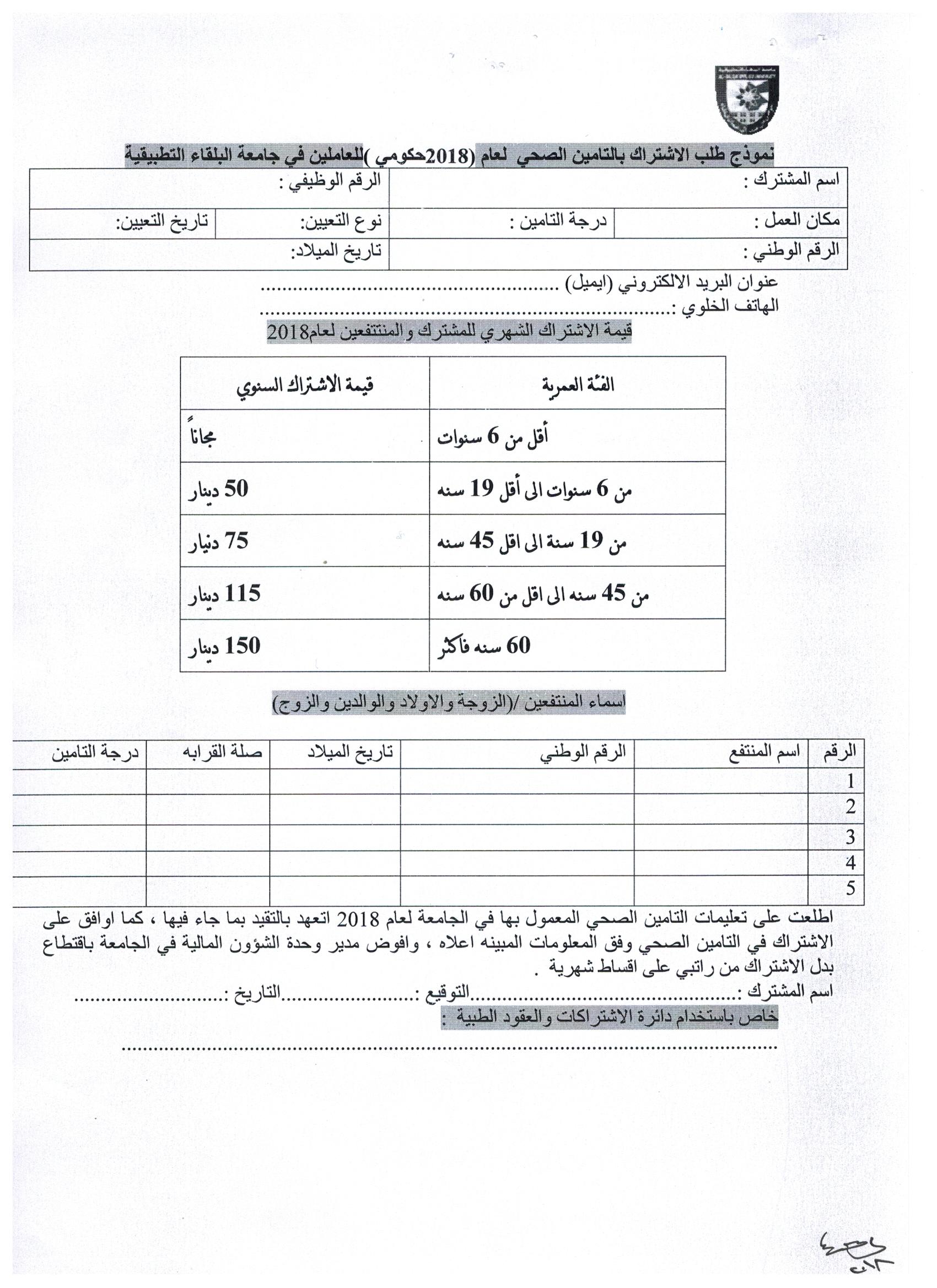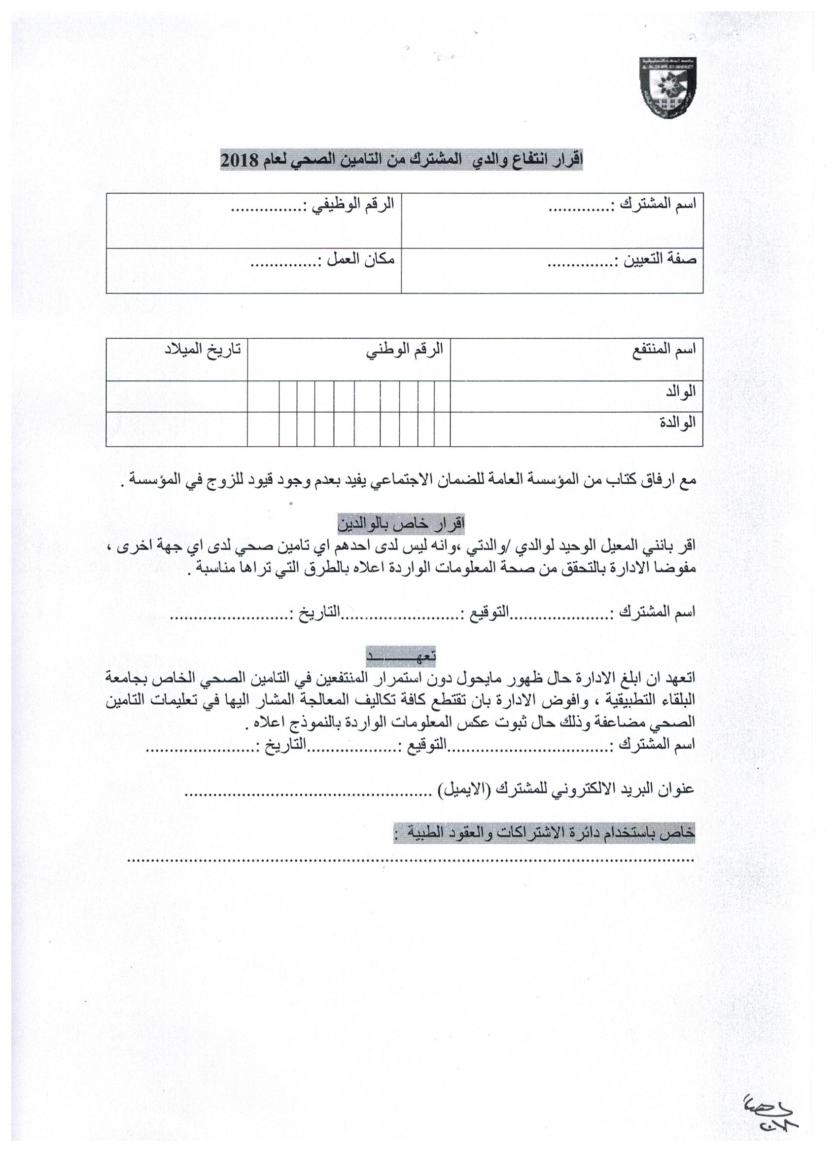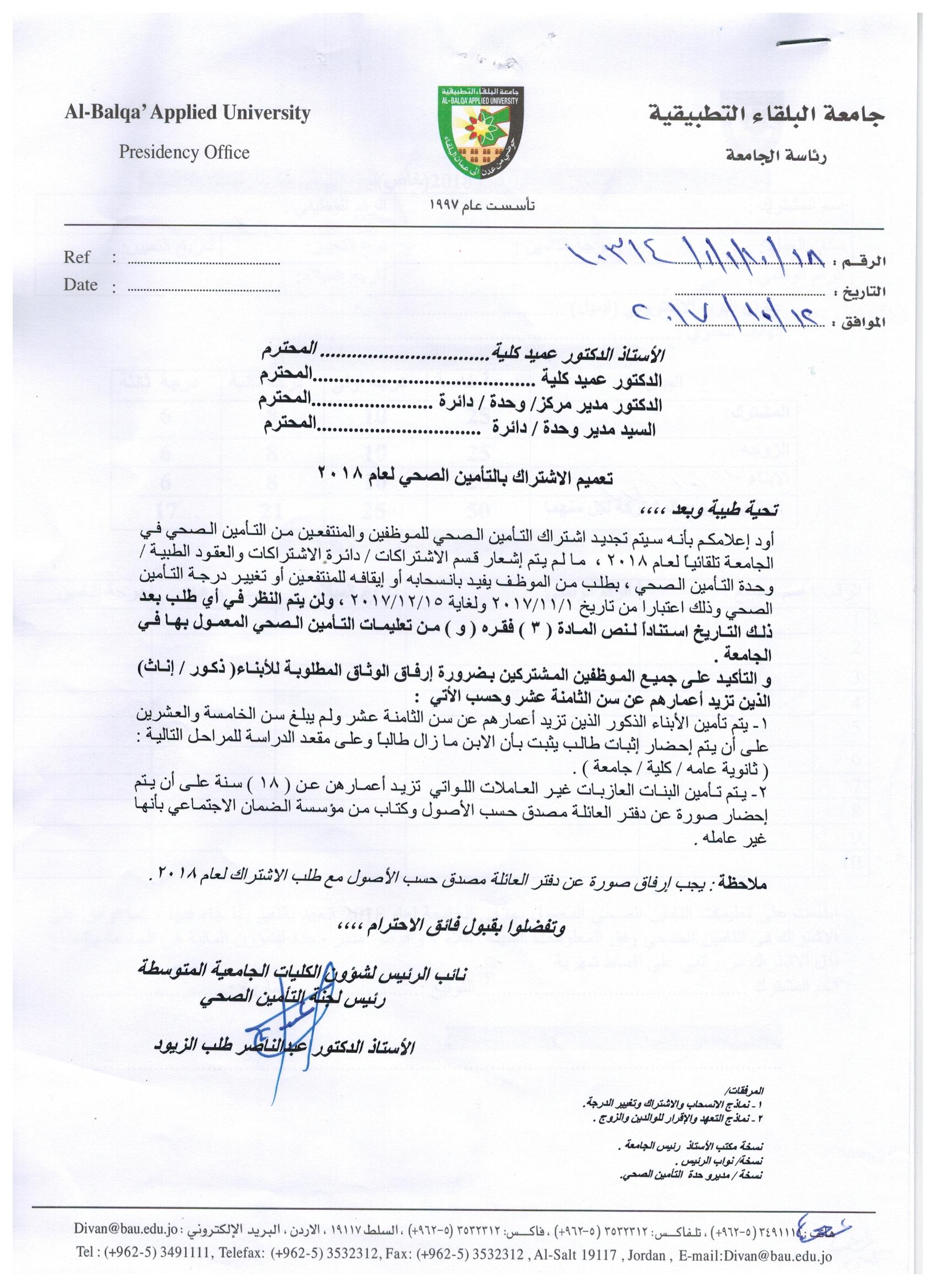 تعميم الاشتراك بالتامين الصحي لعام 2018 ( حسب تعليمات التامين الصحي المعمول بها في الجامعة مادة (3) )