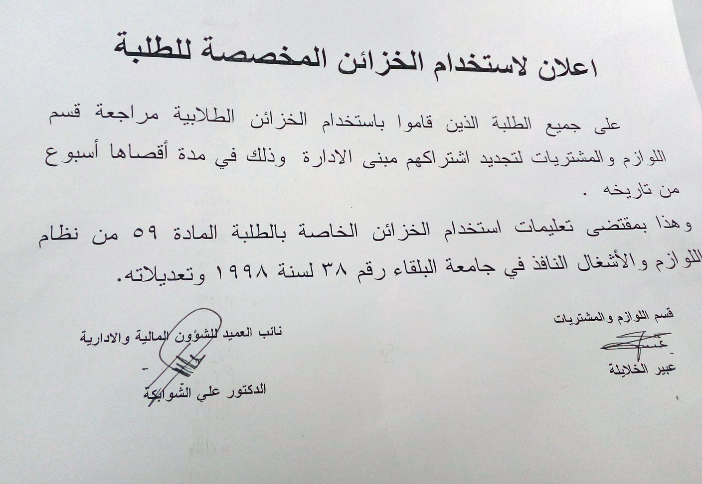 اعلان لاستخدام الخزائن المخصصة للطلبة