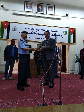 وفي نهاية العرض قدم عميد الكلية درع الجامعة لادارة العلاقات العامة والاعلام الامني في مديرية الامن العام تقديرا لجهودهم .
