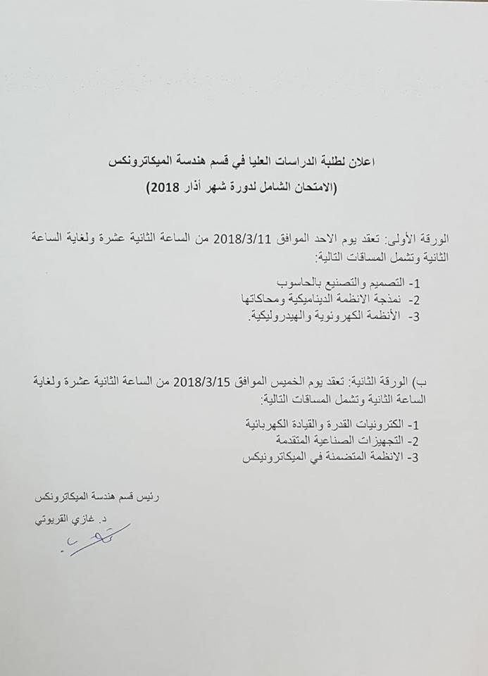 اعلان لطلبة الدراسات العليا في قسم هندسة الميكاترونكس