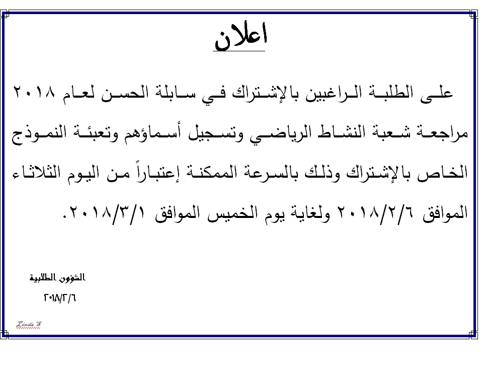 اعلان صادر عن الشؤون الطلابية / الاشتراك في سابلة الحسن 2018