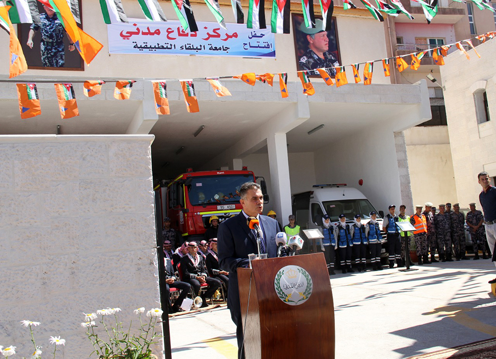 نجتمع اليوم لنحتفل في افتتاح المركز الذي اقامته جامعة البلقاء التطبيقية عظما وزينه الدفاع المدني بمعداته وتجهيزاته وتوجه بشبابه الكفؤ والذين سيحافظون على ممتلكات وحماية ارواح المواطنين في هذا الجزء من مدينة السلط وما حولها من محافظة البلقاء الطيبة وان هذا الانجاز تم نتيجة للعمل المتكامل بين مؤسستين وطنيتين حريصتين على تقديم افضل ما لديهما لخدمة المجتمع الاردني واخص هذا الجزء من الوطن في السلط وما حولها.