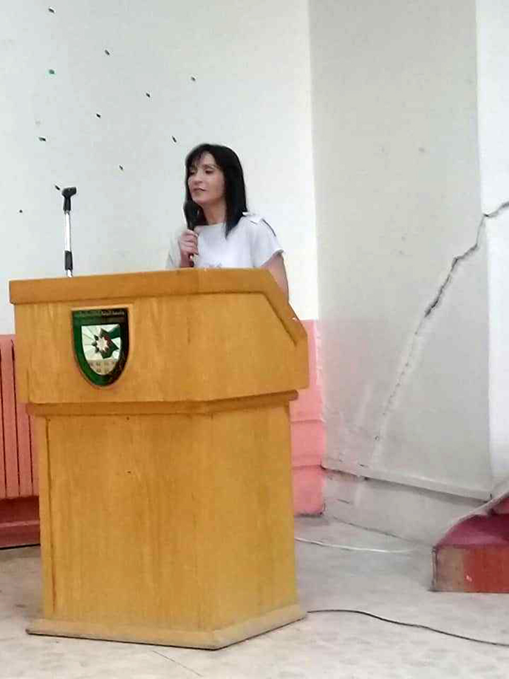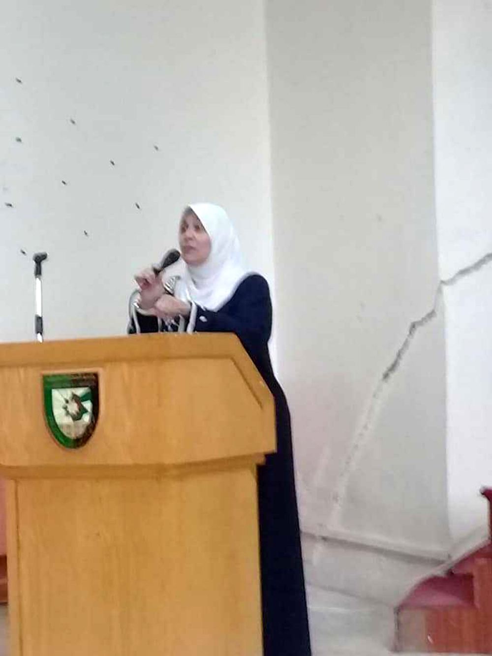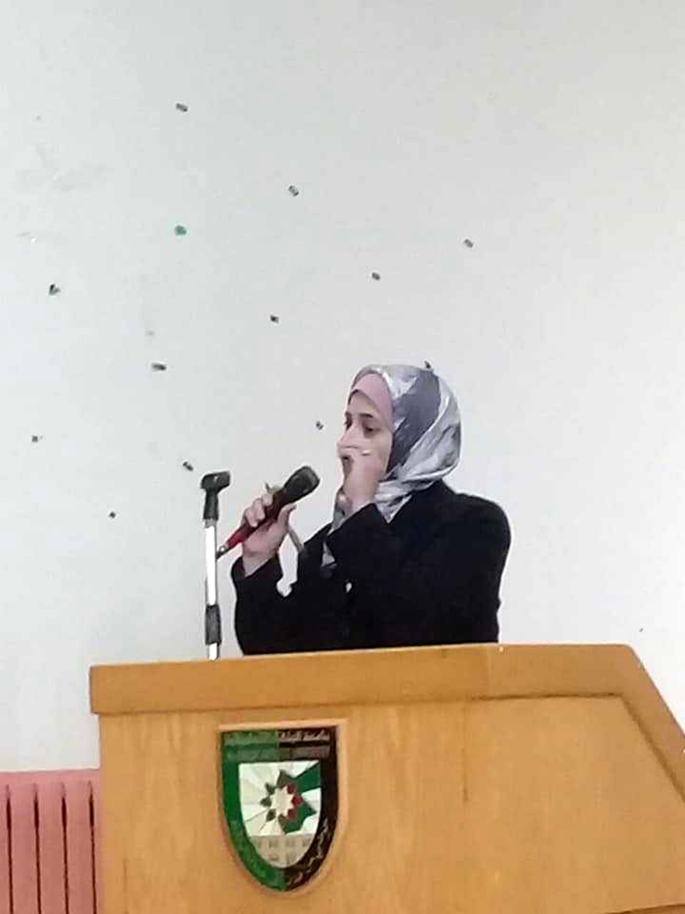 تلتها مساعد العميد للشؤون الطلابية الدكتورة صفاء الصمادي والتي استعرضت بعض الخدمات التي يقدمها قسم الشؤون الطلابية ومدى ارتباط القسم بالطالبات وضرورة امتلاك كل طالبة نسخة من دليل الطالب والالتزام بكافة  بالحقوق والواجبات الواجب المنصوص عليها فيه ، ونبهت الطالبات إلى أهمية حضور المحاضرات وتجنب الغياب وعدم تجاوز الحد المسموح به ،ثم بينت لهن النظام المتبع لاحتساب المعدل التراكمي الذي يتمثل بترميز العلامة كما وضرورة معرفة طريقة استخدام النظام الإلكتروني عند تسجيل المواد وسحبها واسقاطها حتى لا تفقد الطالبة أي شيء من حقوقها.
