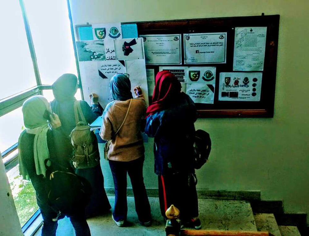 قام مركز اللغات بعمل "جدارية عزاء" تضامناً مع أسر الضحايا لحادثة البحر الميت, حيث قام الطلاب بالتوقيع على الجداريه و التعبير عن مشاعر الحزن و مشاركتهم العزاء للمتوفيين والتمنيات بالشفاء العاجل للمصابين.