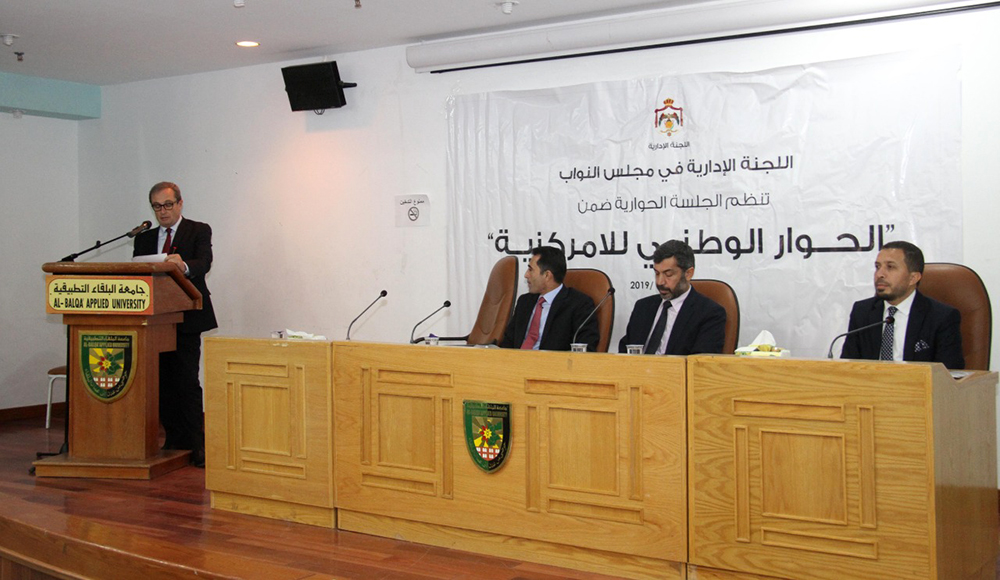 استضافت جامعة البلقاء التطبيقية الجلسات الحوارية التي نظمتها اللجنة الإدارية في مجلس النواب بالتعاون مع وزارة الشؤون السياسية والبرلمانية ضمن الحوار الوطني اللامركزية بحضور نائب رئيس الجامعة للشؤون الاكاديمية الاستاذ الدكتور غاندي انفوقة مندوبا عن رئيس الجامعة الاستاذ الدكتور عبدالله سرور الزعبي وبمشاركة رئيس اللجنة الدكتور علي الحجاحجة ورئيس مجلس محافظة البلقاء موسى العواملة والدكتور احمد العجارمة من وزارة الشؤون السياسية والبرلمانية وعدد من أعضاء مجلس النواب ومجلس محافظة البلقاء .