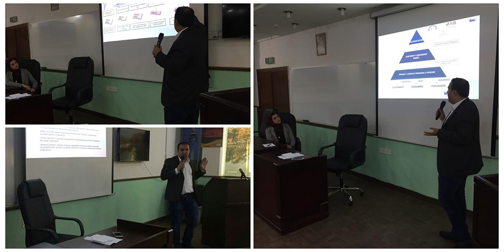 هذا وقد رحبت مديرة المركز بالمحاضر الرئيسي في الندوة وهو السيد طلال الحرافشة رئيس قسم الاعتماد في نظام الاعتماد والتقييس وهو مقيم ومدرب مع وحدة الاعتماد ورئيس اللجنة الفنية للجهاز العربي للاعتماد (ARAC). حيث تحدث عن اعتماد المختبرات وإجراءات الحصول على اعتماد المختبرات وفوائده للمختبرات، وأكد على أن اعتماد المختبر يعتبر اعتراف رسمي بأن المختبر يعمل حسب نظام لإدارة الجودة ويتوفر فيه الكفاءة الفنية والقدرة على إيجاد نتائج اختبار صحيحة بشكل دقيق للحد من تكاليف الجودة والتي تتمثل بالتكاليف المترتبة على فشل الاختبار وإعادته، والتكاليف المترتبة على إصلاح الأخطاء في عملية الاختبار، إضافة لذلك يعد اعتماد المختبر ميزة في العطاءات التي تشترط على المتقدمين لها إثبات كفاءة مختبراتهم من خلال حصول هذه المختبرات على الاعتماد. كما تطرق السيد الحرافشة بشكل خاص لأهمية الاعتماد لمختبرات المياه، وقد عرض الإجراءات الرئيسة للحصول على الاعتماد، وركز في عرضه على متطلبات المواصفة الدوليةISO/IEC 17025:2017 الخاصة بالمتطلبات العامة لكفاءة مختبرات الفحص والمعايرة والتي هي المعيار الذي يتم تطبيقه من المختبرات من أجل التقدم بالحصول على الاعتماد.