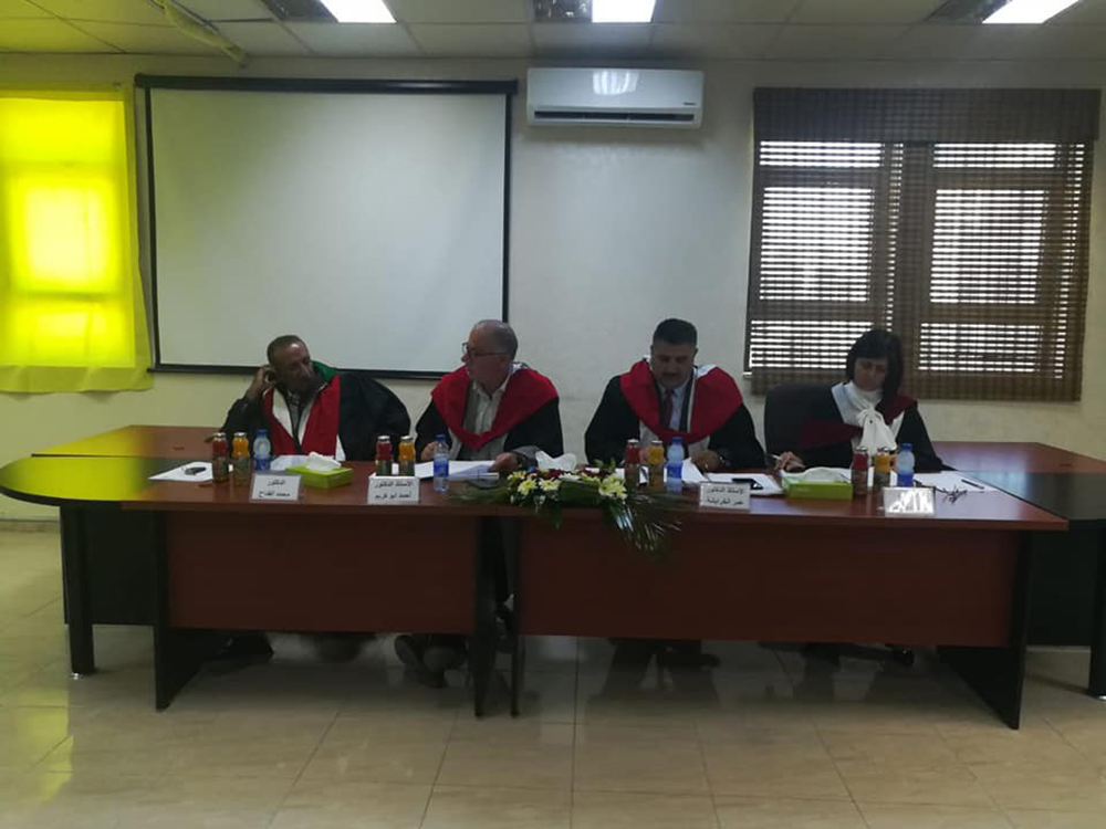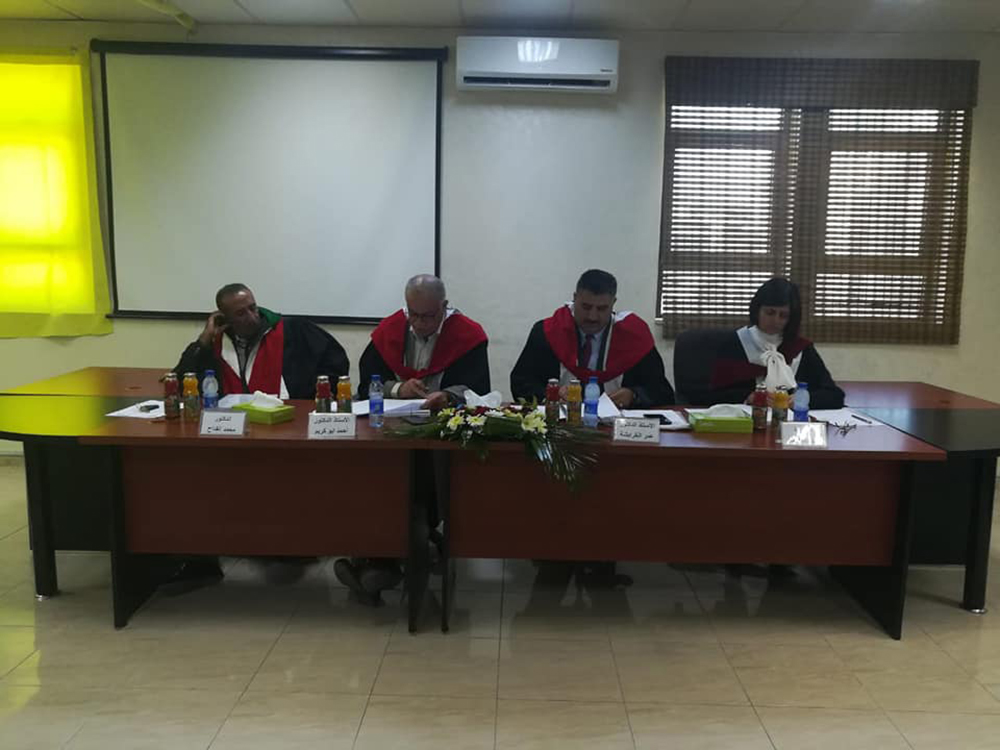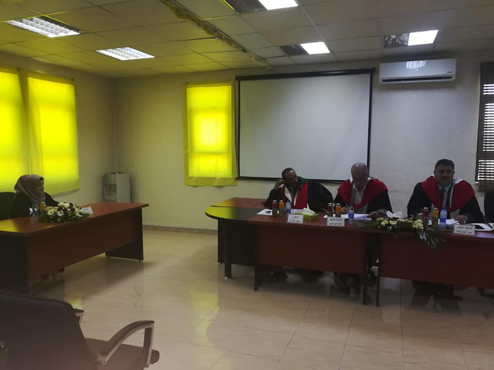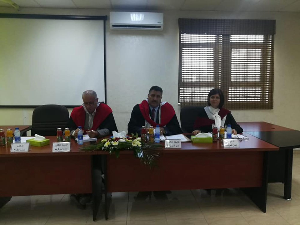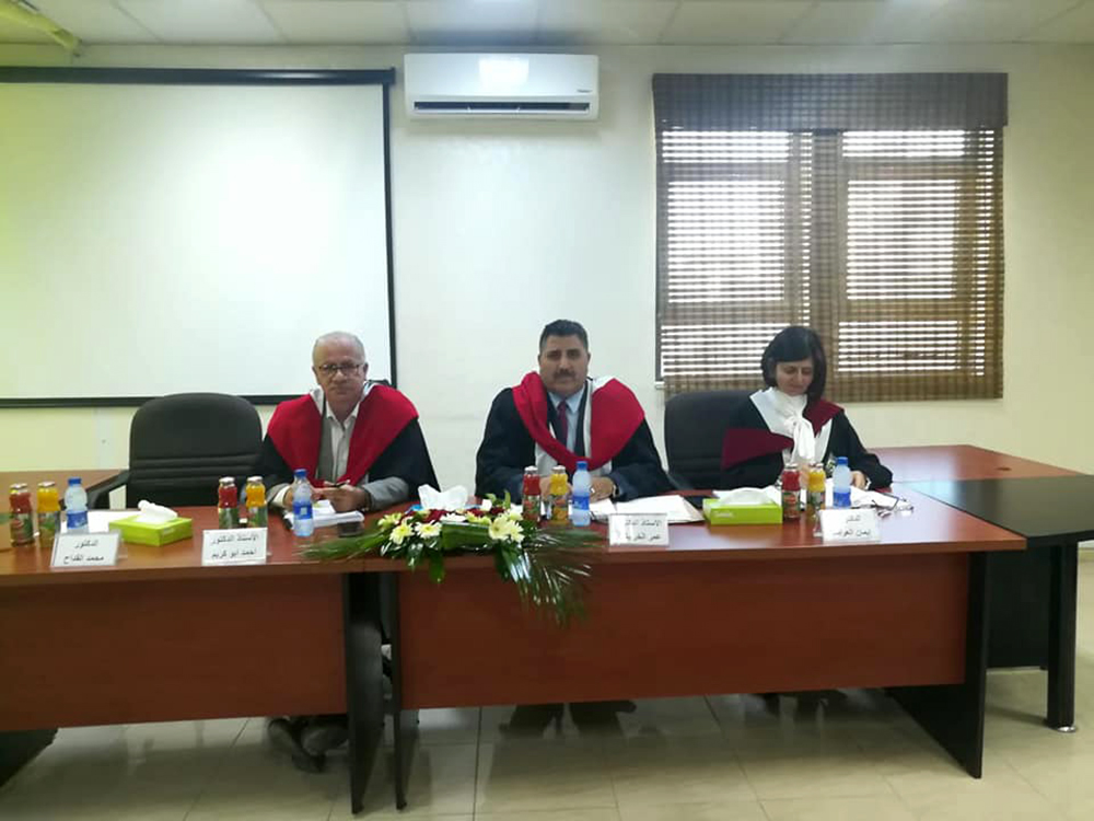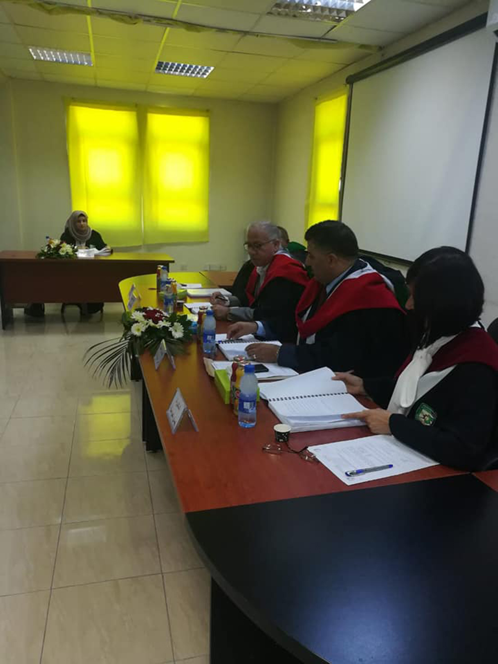 تم في صباح يوم الأحد الموافق 2019/7/28 مناقشة رسالة ماجستير للطالبة ميس حسين محمد عادي تخصص الإدارة التربوية بعنوان (درجة ممارسة التمكين الإداري لدى أعضاء هيئة التدريس في الجامعات الأردنية الرسمية وعلاقتها بمهارتهم القيادية)