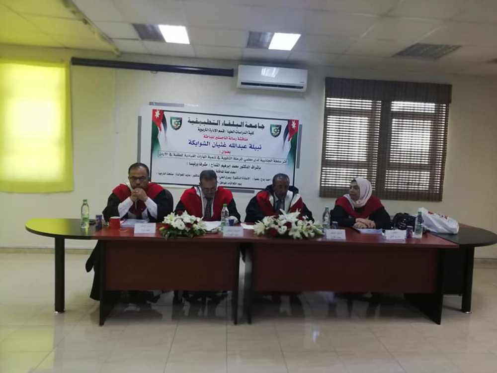 تم في صباح يوم الثلاثاء الموافق20/8/2019، مناقشة رسالة ماجستير للطالبة نبيلة عبدالله غثيان الشوابكة ، تخصص الإدارة التربوية، بعنوان (أثر سلطة الجاذبية لدى معلمي المرحلة الثانوية في تنمية المهارات القيادية للطلبة في الأردن )