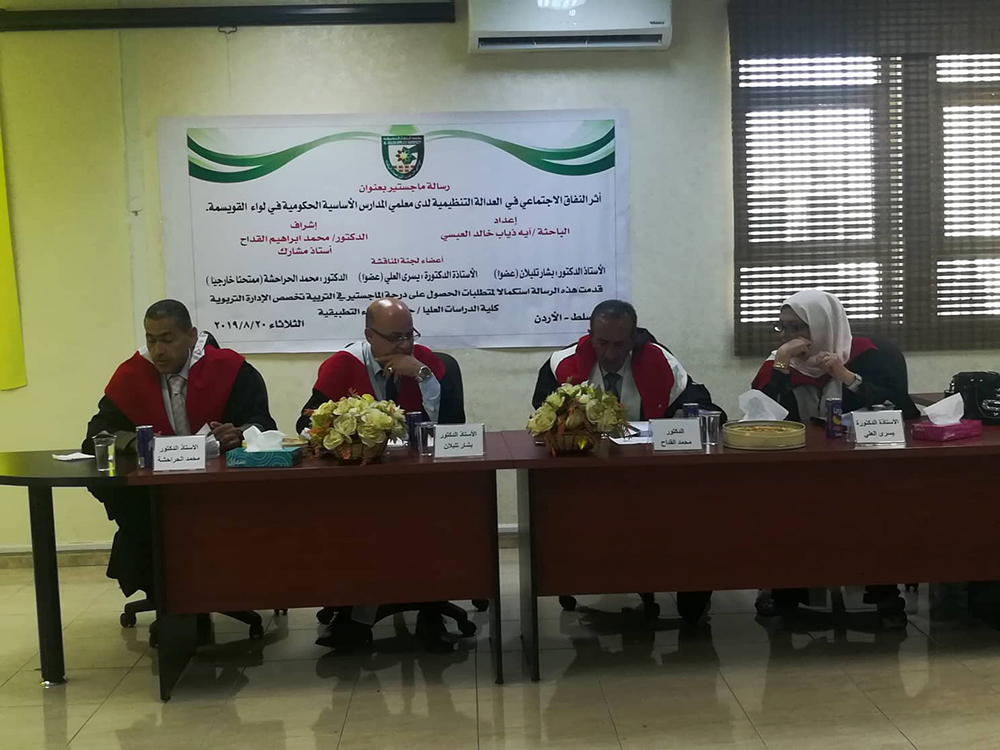 تم في صباح يوم الثلاثاء الموافق20/8/2019، مناقشة رسالة ماجستير للطالبة آية ذياب خالد العبسي ، تخصص الإدارة التربوية، بعنوان (أثر النفاق الاجتماعي في العدالة التنظيمية لدى معلمي المدارس الأساسية الحكومية في لواء القويسمة)