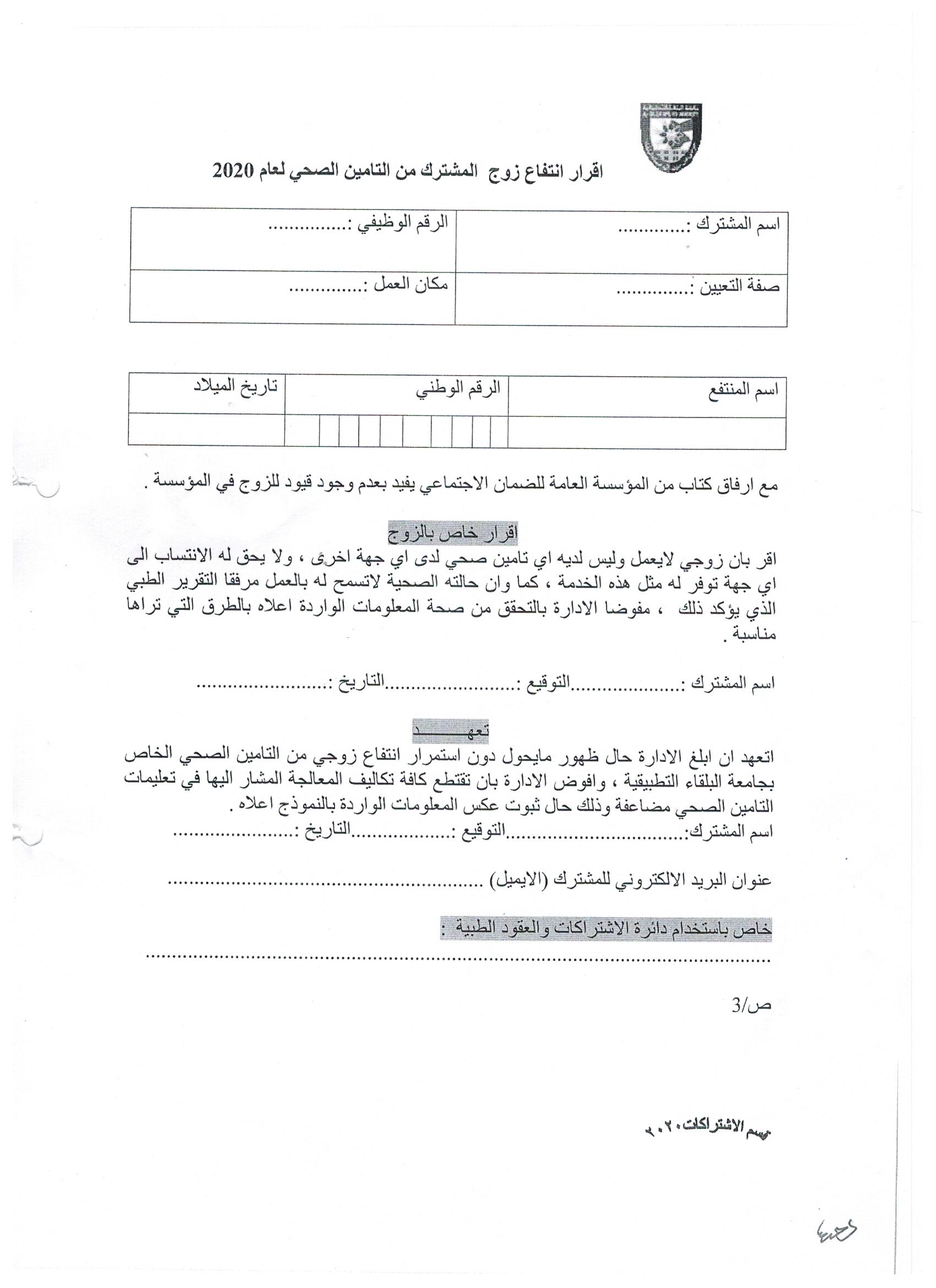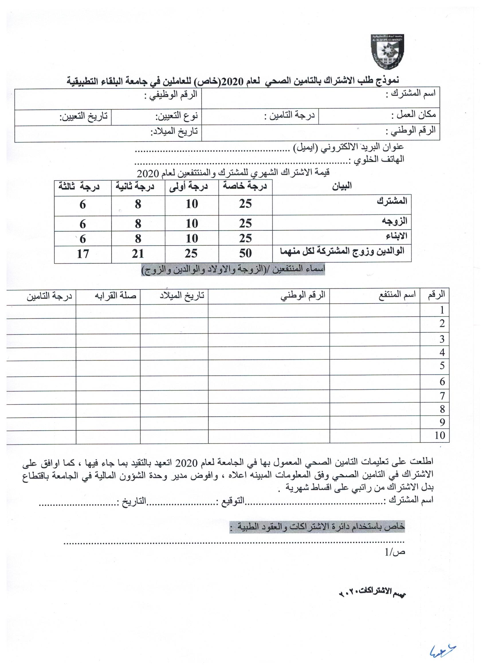 تعميم الاشتراك بالتامين الصحي لعام 2020( حسب تعليمات التامين الصحي المعمول بها في الجامعة مادة (3) ) من تاريخ 1/11/2019 ولغاية تاريخ 15/12/2019 وحسب المرفقات