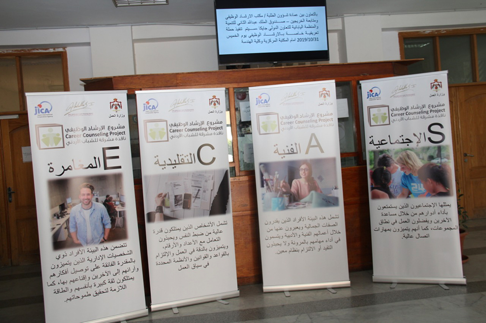 نظمت عمادة شؤون الطلبة /مكتب الإرشاد الوظيفي ومتابعة الخريجين / صندوق الملك عبدالله الثاني للتنمية وبالتعاون مع المنظمة اليابانية للتعاون الدولي ( جايكا) حملة تعريفية بالإرشاد الوظيفي لغايات تعريف الطلبة بأهمية الإرشاد الوظيفي وخدمات المكتب في جامعة البلقاء التطبيقية وانعكاس ذلك على الطلبة ومسارهم الوظيفي .