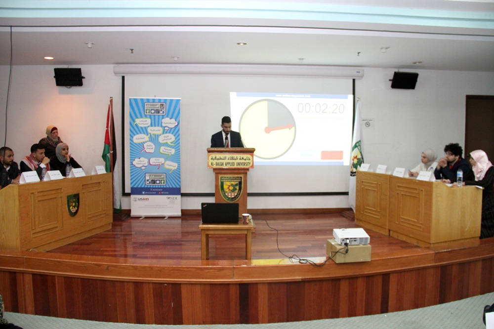 وعلى صعيد متصل اقيمت مناظرة طلابية بين طلبة جامعة البلقاء التطبيقية وجامعة الحسين التقنية بعنوان " قانون الانتخاب الحالي لا يعزز المشاركة السياسية للشباب حيث مثل فريق جامعة البلقاء التطبيقية الرأي المعارض لقانون الانتخاب والذي لا يعزز مشاركة الشباب فيما مثل فريق جامعة الحسين التقنية الرأي المؤيد للقانون .وقد اسفرت نتيجة المناظرة عن فوز فريق جامعة البلقاء التطبيقية
