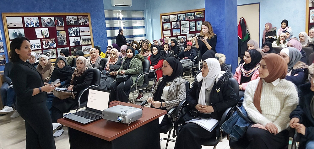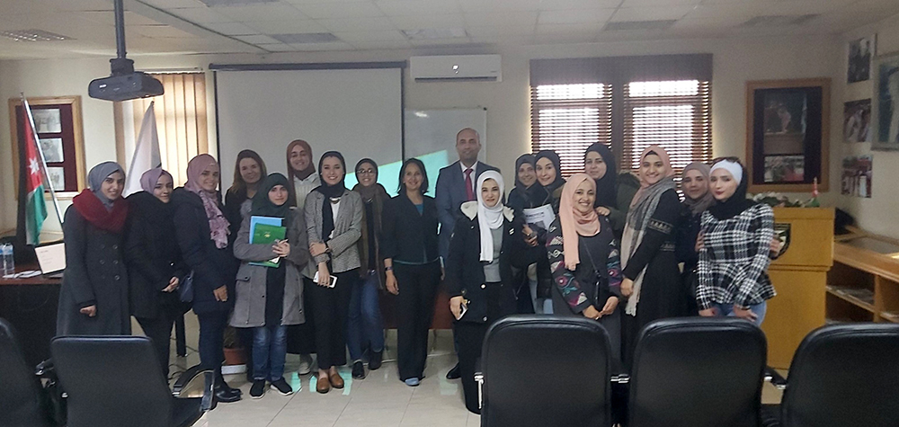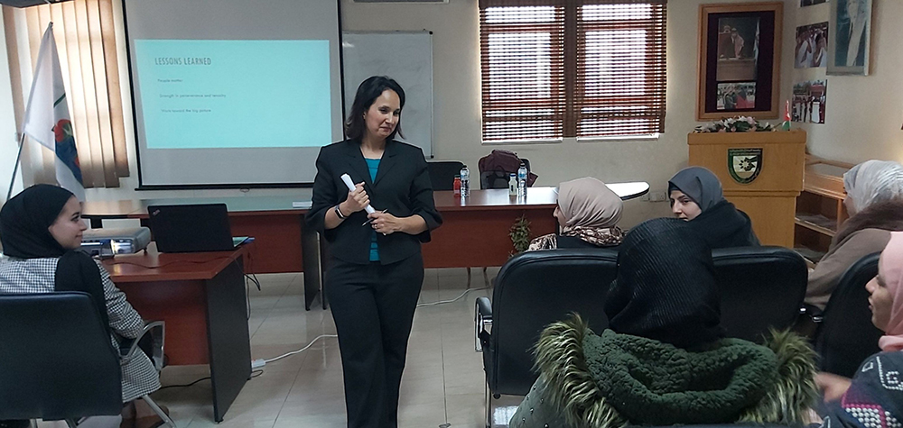 ثم ابتدأت السيدة دانا حديثها  باللغة الانجليزية عن مسيرتها المهنية وخبراتها العملية في الأردن وشجعت الطالبات على خلق الدافع والحماس لإكمال مسيرتهم الجامعية وما بعد الجامعة والبحث عن فرص وبدائل مناسبة بما يتوافق مع طموحهن وآمالهن .