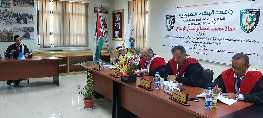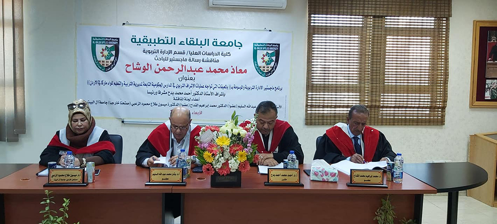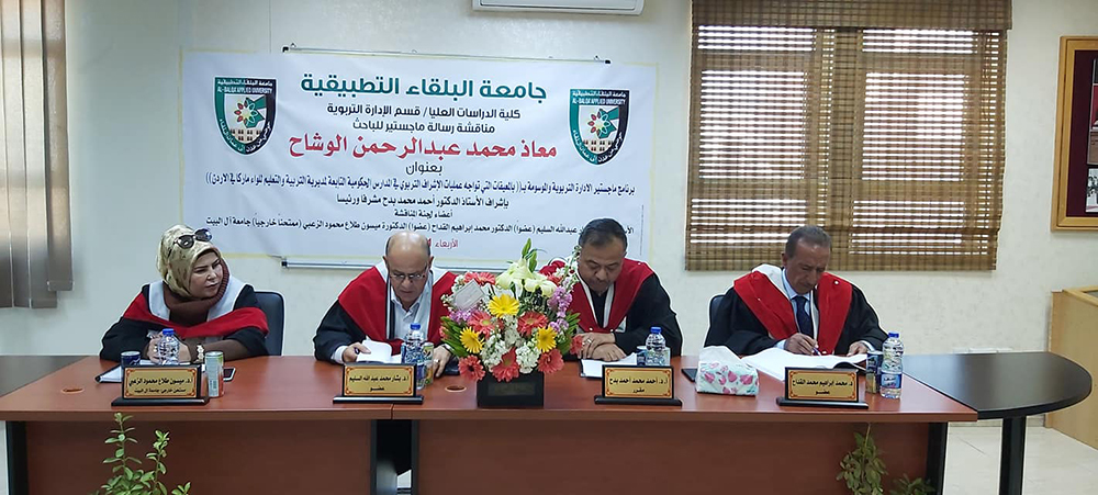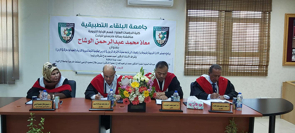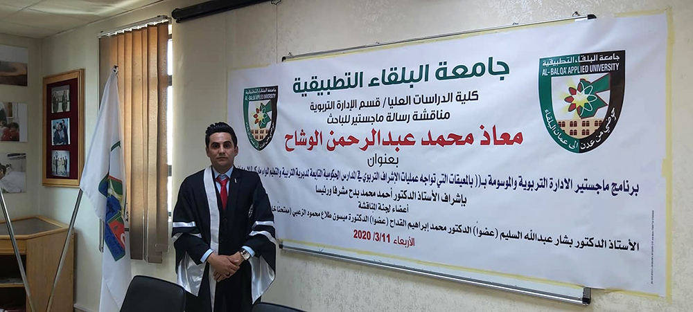 تم في صباح يوم الأربعاء الموافق 11/3/2020 ، مناقشة رسالة ماجستير للطالب معاذ محمد عبد الرحمن الوشاح تخصص الإدارة التربوية، قسم التخصص: العلوم التربوية بعنوان (المعيقات التي تواجه عمليات الإشراف التربوي في المدارس الحكومية التابعة لمديرية التربية والتعليم للواء ماركا في الأردن)