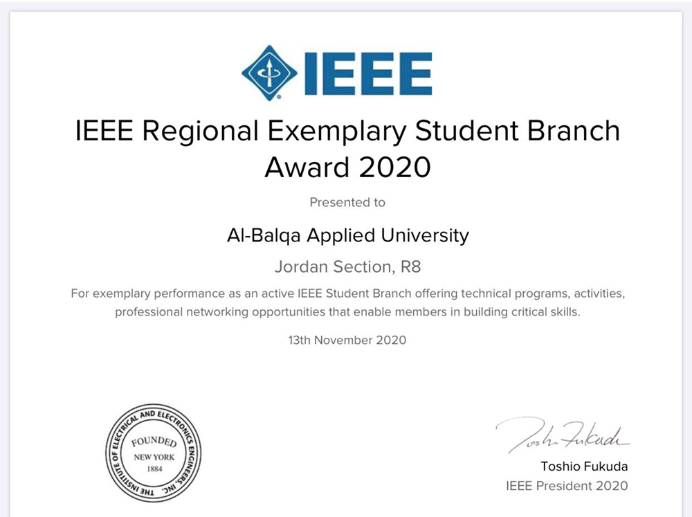 واصل الفرع الطلابيّ IEEE في جامعة البلقاء التطبيقية- كلية الهندسة التكنولوجية تميزه وإنجازاته على المستوى العالمي حيث فاز للمرة الثالثة على التوالي بجائزة أفضل فرع طلابيّ على مستوى المنطقة الثامنة و التي تشمل الشرق الأوسط و افريقيا و أوروبا..