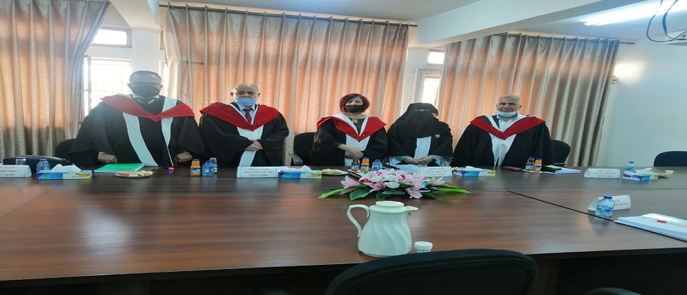 برئاسة الدكتورة دلال الزعبي من كلية اربد الجامعية مناقشا ورئيسا و الاستاذ الدكتور بشار عبدالله السليم مناقشاً داخلياً /كلية الاميره عاليه والاستاذ الدكتور محمد ابدح مناقشاً داخلياً /كلية الاميره عاليه والاستاذ الدكتور خليفة مصطفى أبو عاشور مناقشاً خارجياً /جامعة اليرموك وتم منح الطالبة درجة الماجستير.