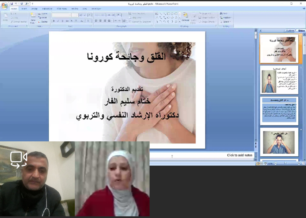 وتحدثت في المحاضرة الدكتورة ختام الفار الأخصائية في الإرشاد والصحة النفسية حول القلق النفسي واثر جائحة كورونا وأثره على حياتنا واستعرضت الدكتور الفار الأساليب الصحية المناسبة في التعامل في ظل هذه الظروف.