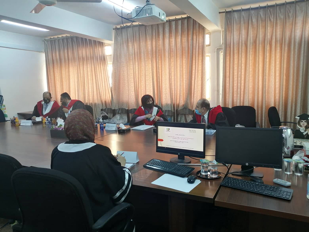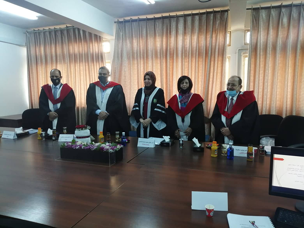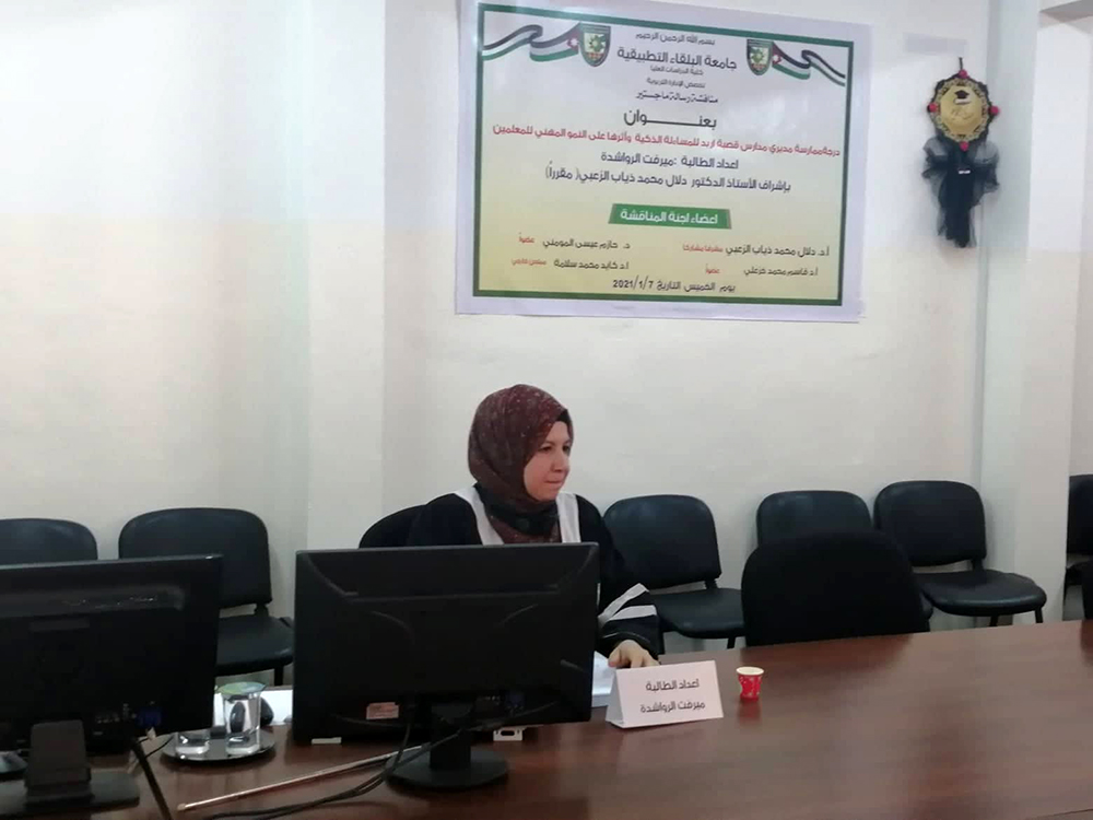 وتشكلت لجنة المناقشة من الدكتورة دلال محمد الزعبي مقرراً ومشرفاً مشاركاً وعضوية كل من الأستاذ الدكتور قاسم محمد خزعلي  والدكتور حازم عيسى المومني ، والأستاذ الدكتور كايد محمد سلامة ممتحناً خارجياً، ، وأشادت اللجنة بموضوع الرسالة وبجهود الطالبة في إعدادها وعرضها، وأعلنت نجاحها مع إجراء بعض التعديلات الطفيفة عليها وحصولها على درجة الماجستير في الإدارة التربوية.