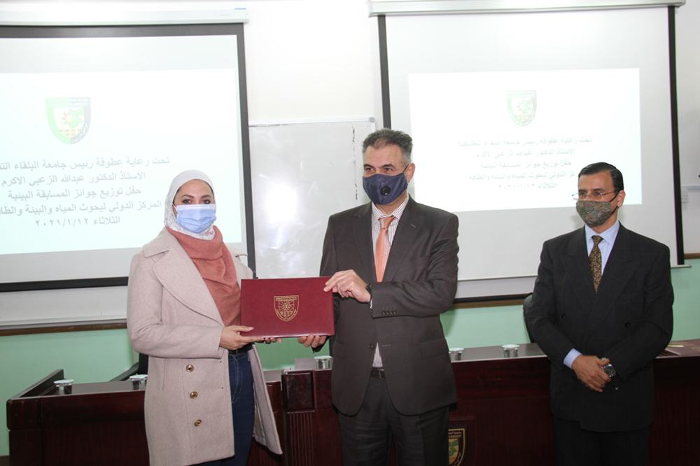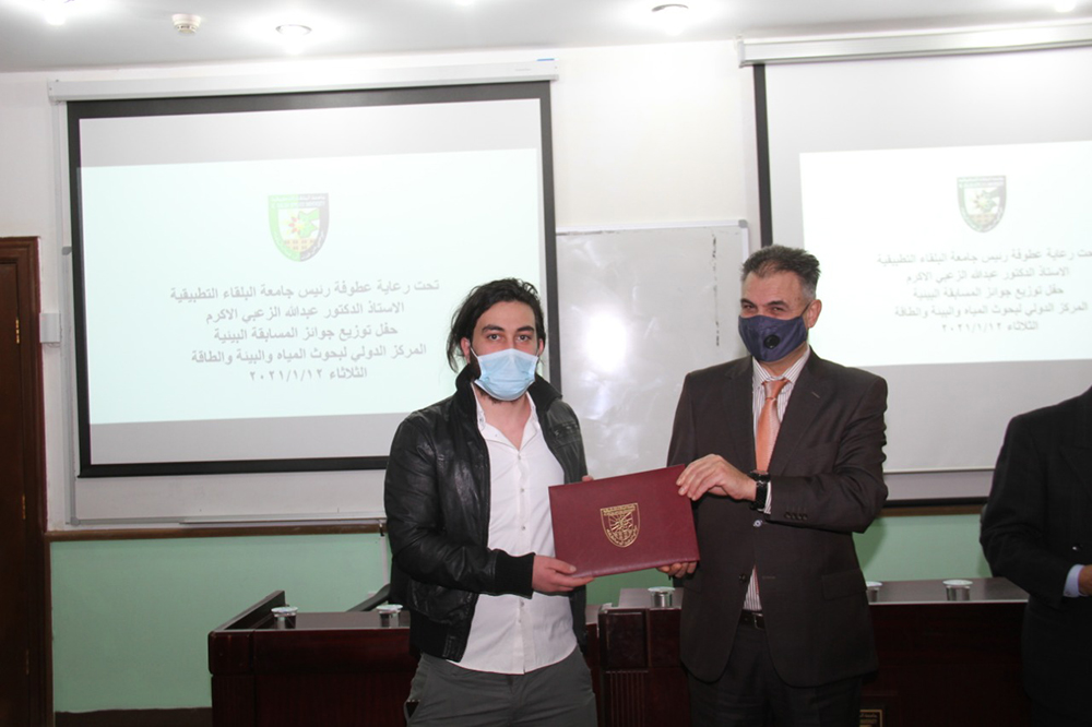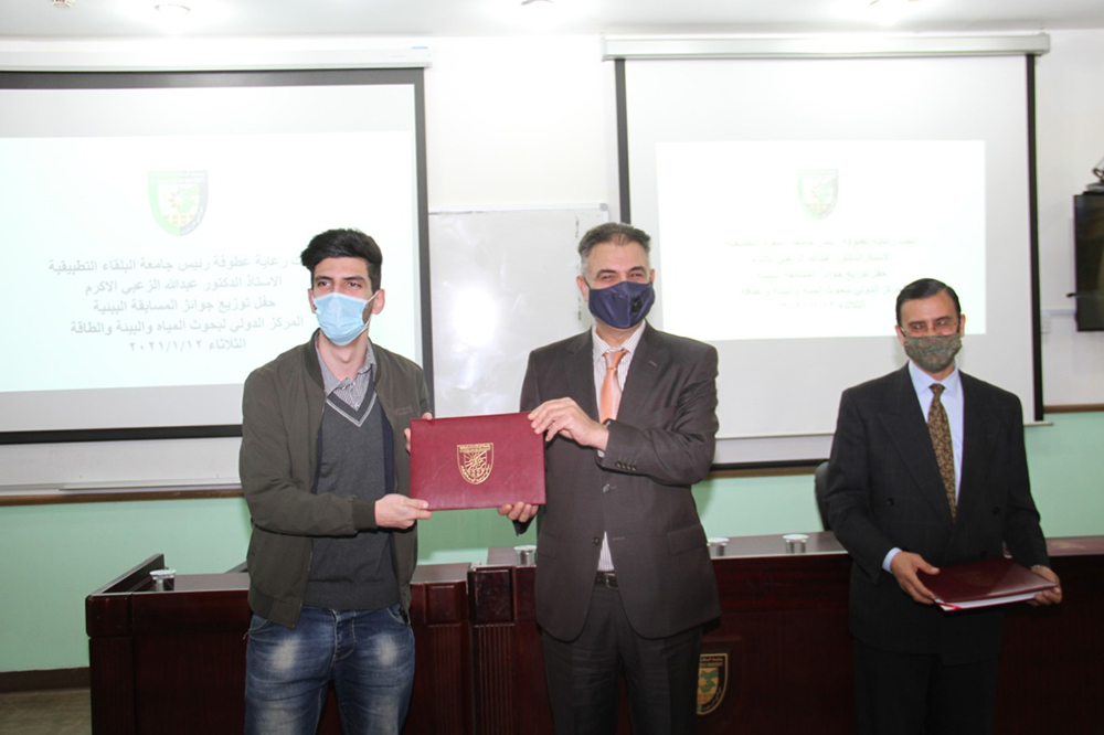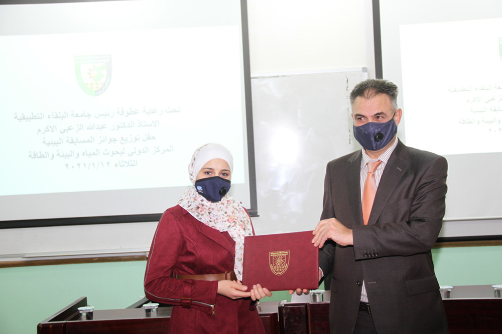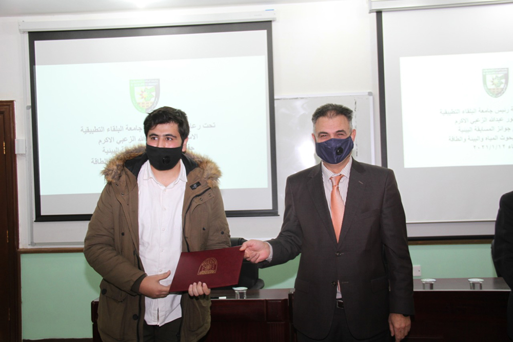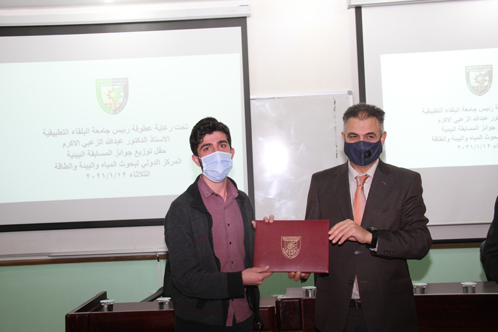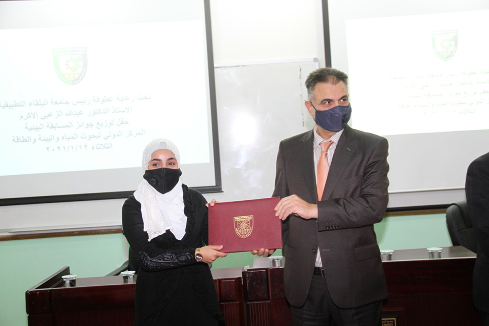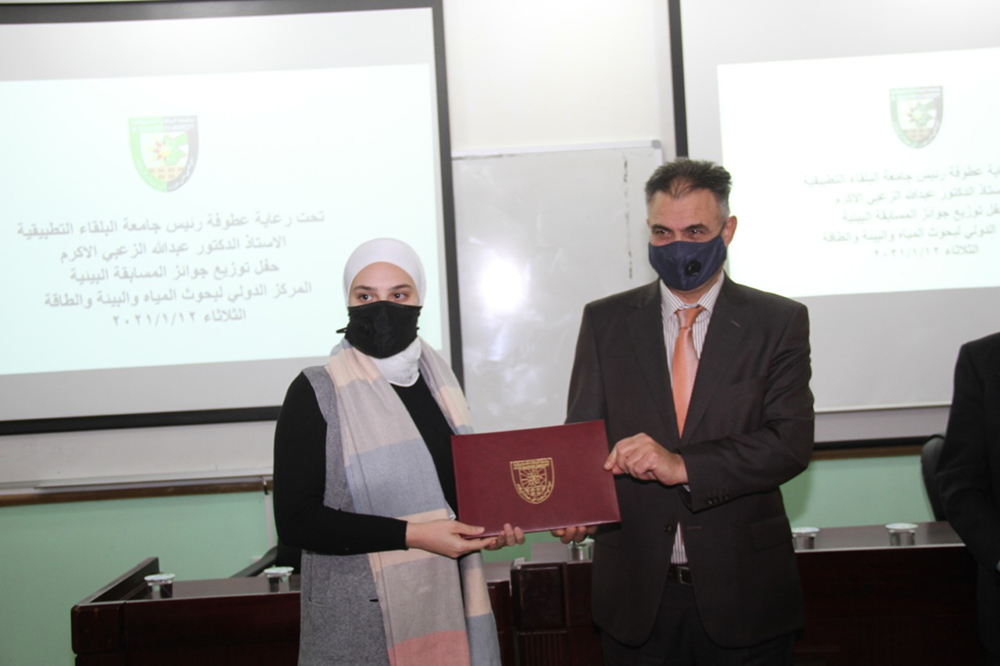 بدوره قال الأستاذ الدكتور محمد أبو ديه مدير المركز الدولي لبحوث المياه والبيئة والطاقة أن جامعة البلقاء التطبيقية أخذت عهدا أن لا تنأى عن مسيرة الإنجاز وأن تكون دائما في الركب مشيرا إلى أنها صنعت مجدا يليق بها لافتا أن الجامعة تكرم اليوم ثلة من أبناءها الطلبة الذين تميزوا في المشاركة بالمسابقة البيئية والتي تأتي كنوع من المشاركة المجتمعية لرفع الوعي البيئي بين طلبة الجامعة.