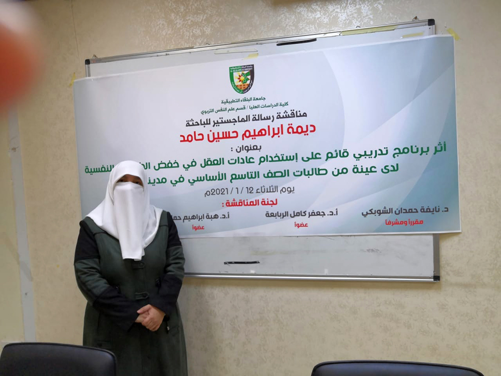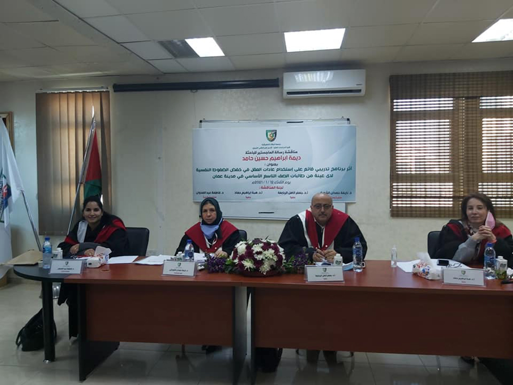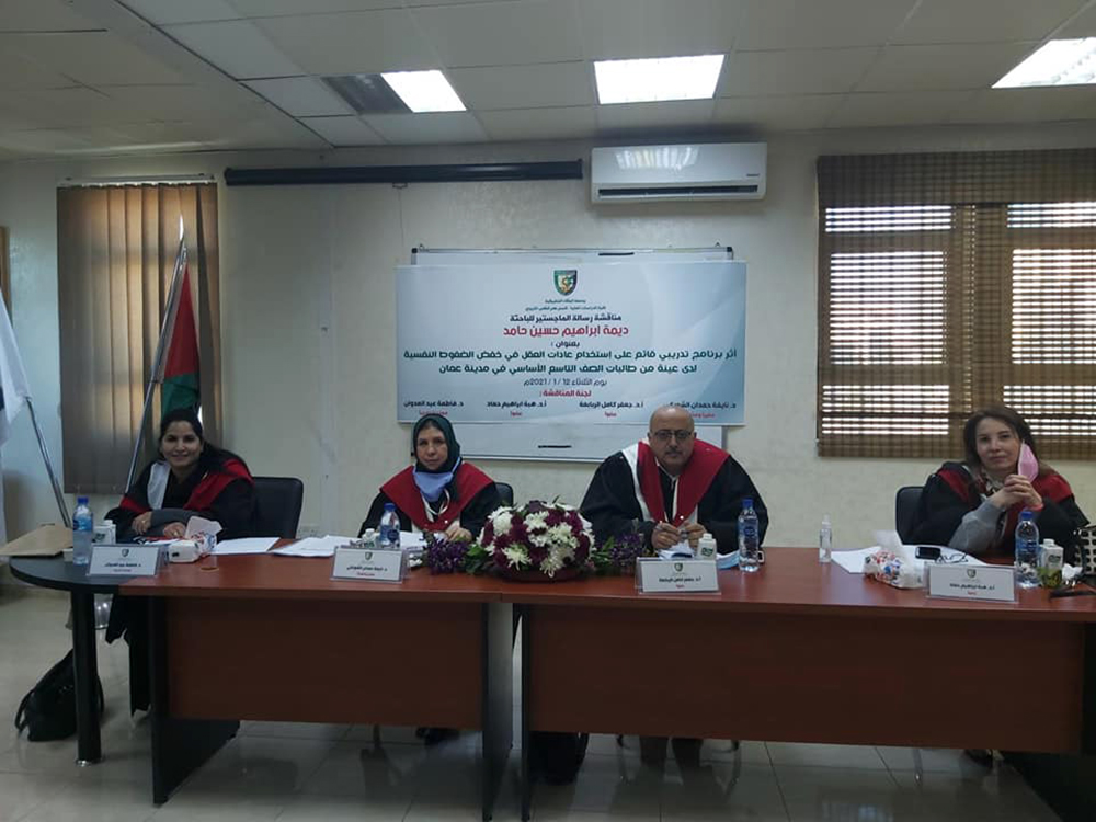 تم في صباح يوم االثلاثاء الموافق 12/1/2021 ، مناقشة رسالة ماجستير للطالبة ديمة ابراهيم حسين حامد تخصص علم النفس التربوي، قسم علم النفس والتربية الخاصىة بعنوان (أثر برنامج تدريبي قائم على استخدام عادات العقل في خفض الضغوط النفسية لدى عينة من طالبات الصف التاسع الأساسي في مدينة عمان )