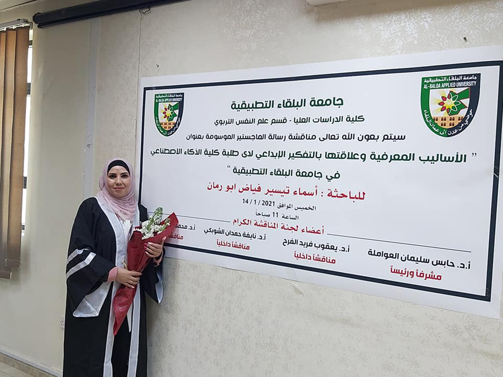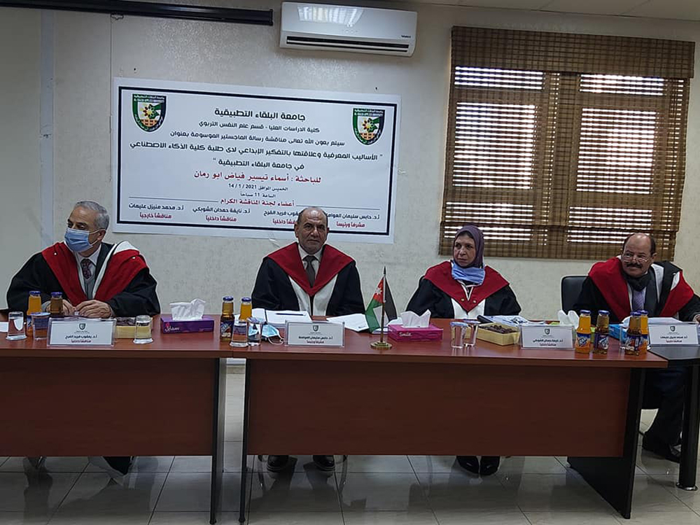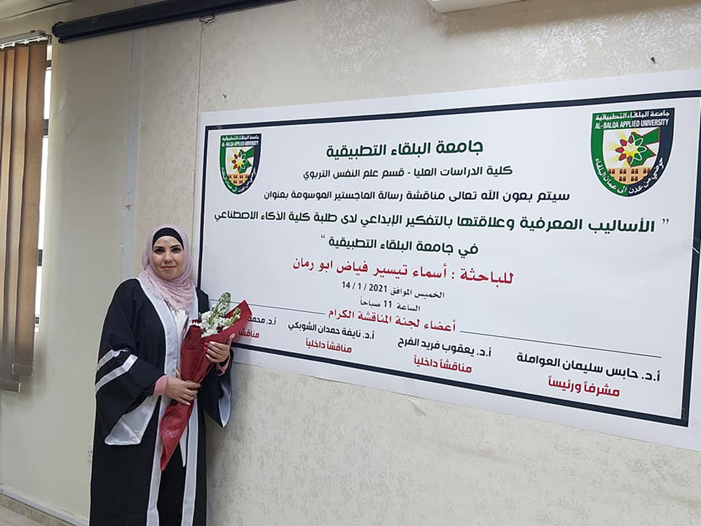 تم في صباح يوم الخميس الموافق 14/1/2021، مناقشة رسالة ماجستير للطالبة أسماء تيسير فياض أبو رمان  تخصص علم النفس التربوي ،  قسم علم النفس والتربية الخاصة ( الأساليب المعرفية وعلاقتها بالتفكير الإبداعي لدى طلبة كلية الذكاء الاصطناعي في جامعة البلقاء التطبيقية )