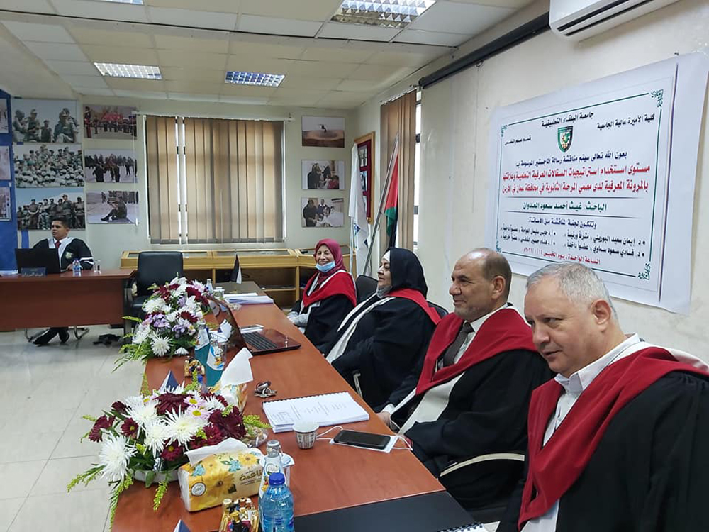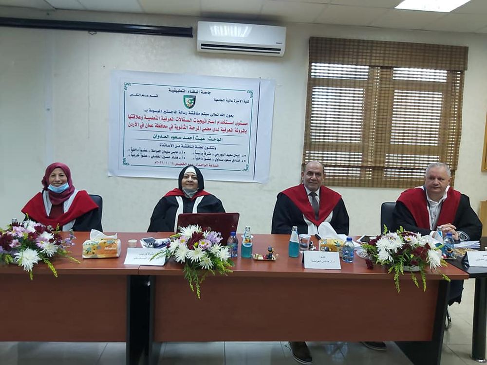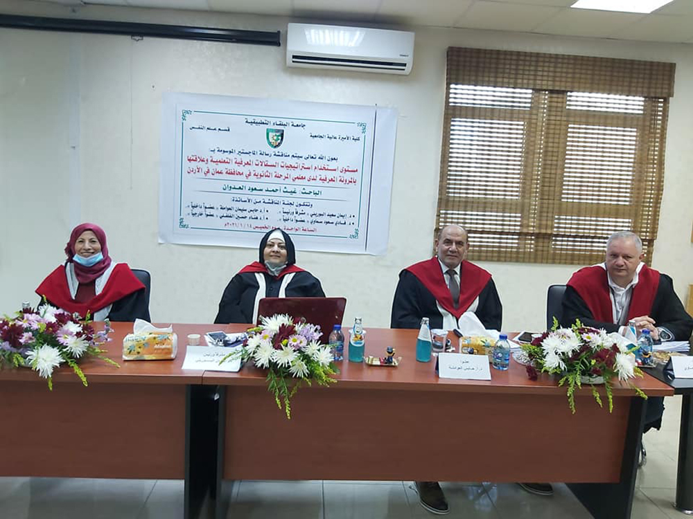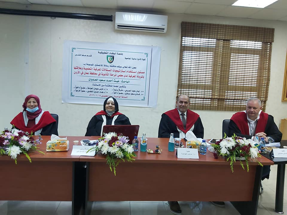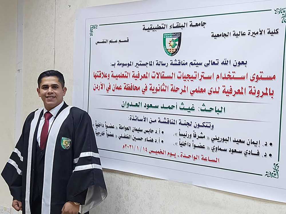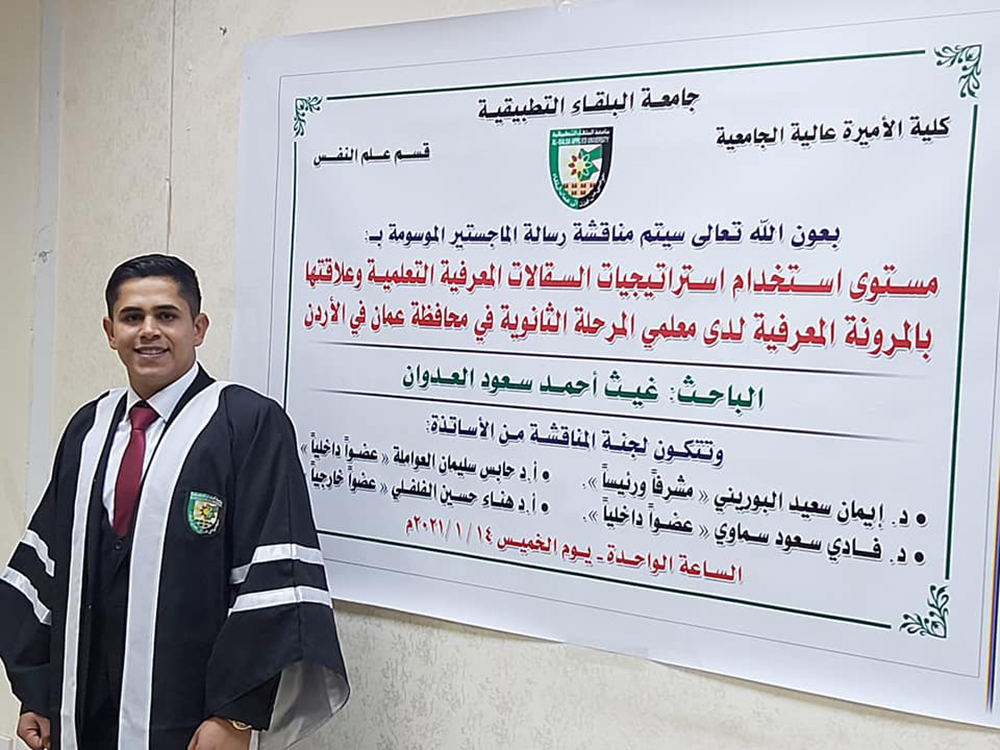 تم في صباح يوم الخميس الموافق 14/1/2021، مناقشة رسالة ماجستير للطالب غيث احمد سعود العدوان تخصص علم النفس التربوي ، قسم علم النفس والتربية الخاصة ( مستوى استخدام استراتيجيات السقالات المعرفية التعليمية وعلاقتها بالمرونة المعرفية لدى معلمي المرحلة الثانوية في محافظة عمان في الأردن)