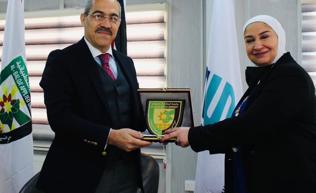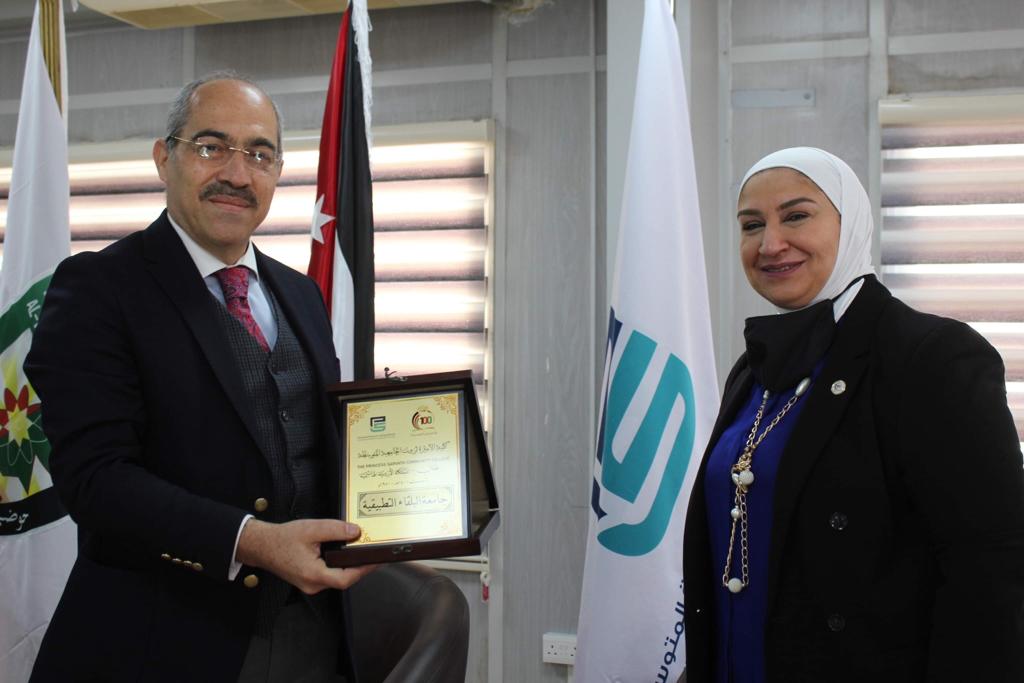 وفي نهاية الافتتاح قدمت عميدة كلية الاميرة ثروت الجامعية المتوسطه الدكتورة شيرين حامد درع الكلية الى الاستاذ الدكتور نضال يونس كما و قدم الاستاذ الدكتور نضال يونس درع جامعة البلقاء