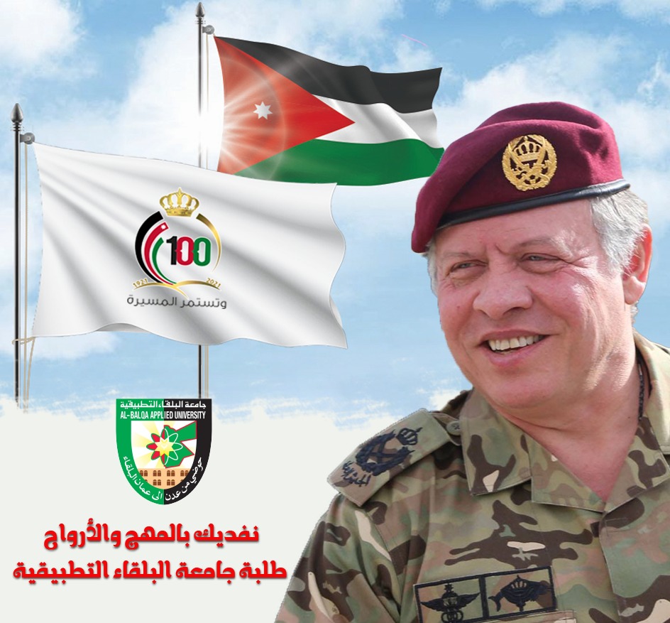 ضمن احتفالات جامعة البلقاء التطبيقية بمئوية تأسيس الدولة الاردنية والاحتفال بالأعياد الوطنية صمم طلبة المبادرات والأندية الطلابية في عمادة شؤون الطلبة بوستر اهداء لجلاله الملك عبدالله الثاني ابن الحسين المعظم تحت شعار " نفديك بالمهج والارواح "عبر طلبة جامعة البلقاء التطبيقية عن تجديد ولائهم المطلق وانتمائهم لجلالة الملك عبدالله الثاني ابن الحسين والعرش الهاشمي المفدى والانتماء لتراب الاردن الظهور والدفاع عنه بالمهج والأرواح.