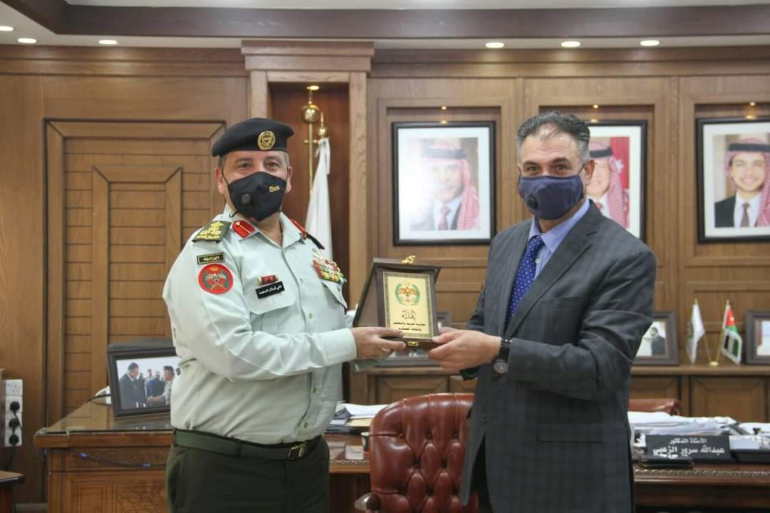 من جهته رحب عطوفة رئيس الجامعة بالحضور مؤكدا اعتزازه بالقوات المسلحة الاردنية حملة الشعار وحماة الديار لما يقوموا به من دور كبير من شأنه خدمة الوطن العزيز وأن التعاون مع القوات المسلحة مستمر بكل الإمكانيات المتوفرة بالجامعة ومن باب تقدير التضحيات التي قام بها شهداء القوات المسلحة والأجهزة الأمنية قامت الجامعة بتسمية العديد من القاعات بأسماء الشهداء تقديرا لتضحياتهم وتخليدا لاسمائهم لتكون قناديل مضيئة تنير الطريق ودروسا حية للولاء والانتماء لثرى هذا الوطن وقيادته المظفرة وفي نهاية اللقاء قام العميد الدعجه بتقديم درع المديريه لرئيس الجامعة .
