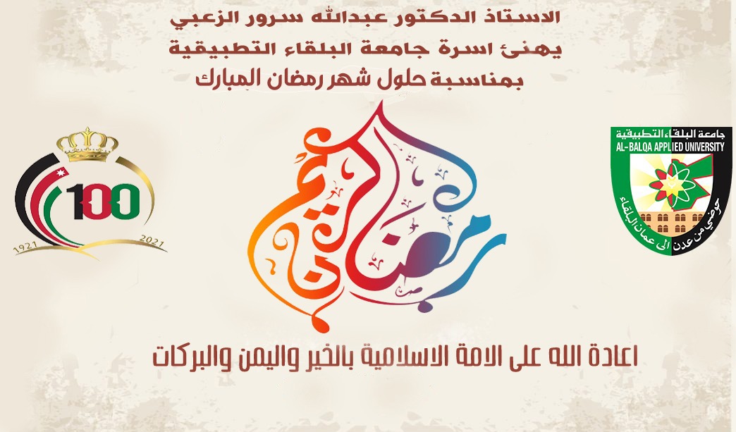 الزملاء أعضاء الهيئتين التدريسية والإدارية أبنائي الطلبة فيسرني أن أتقدم إليكم بخالص التهنئة والتبريك بمناسبة حلول شهر رمضان المبارك أعاده الله عليكم بالخير واليمن والبركات .