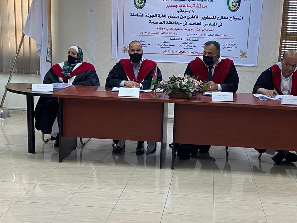 تم في صباح يوم الأربعاء الموافق21/4/2021 ، مناقشة رسالة ماجستير للطالب عمرو خالد عبد المعطي جوازنة تخصص الإدارة التربوية، قسم الإدارة التربوية بعنوان (أنموذج مقترح للتطوير الإداري من منظور إدارة الجودة الشاملة في المدارس الخاصة في محافظة العاصمة)