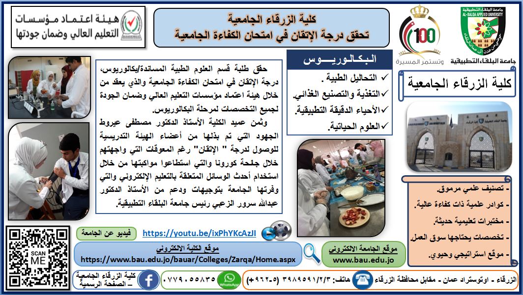 حقق طلبة كلية الزرقاء الجامعية قسم العلوم الطبية المساندة – بكالوريوس ، درجة الإتقان في امتحان الكفاءة الجامعية والذي يعقد من خلال هيئة اعتماد مؤسسات التعليم العالي وضمان الجودة لجميع التخصصات التي تدرس لمرحلة البكالوريوس وهي التحاليل الطبية ، الأحياء الدقيقة التطبيقية ، التغذية والتصنيع الغذائي ، العلوم الحياتية.