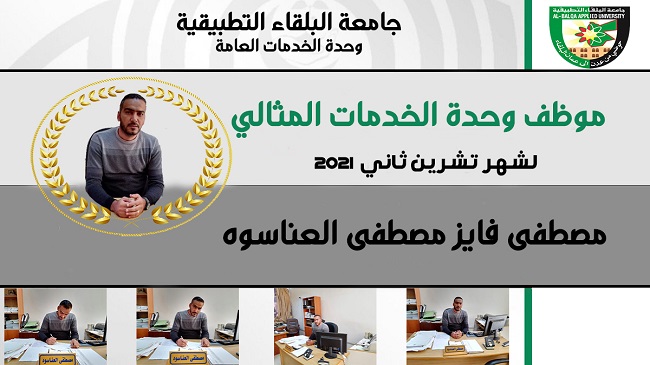استنادا لنهج التميز الذي تسعي له جامعة البلقاء التطبيقية والمبادرة التي اطلقتها وحدة الخدمات العامة "موظف الخدمات المثالي " التي اطلقها مدير الوحدة الدكتور محمد عبد الرزاق ابو رمان