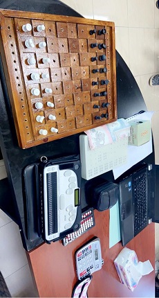 كما وعرضت الأدوات يعتمد عليها المكفوف في حياتة اليومية كجهاز لغة بريل لتعليم القراءة والكتابة والأجهزة الالكترونية الحديثة التي تشمل: الحاسوب أو الجوال أو الآلة الحاسبة المزودة ببرنامج ناطق بلغة المكفوف.