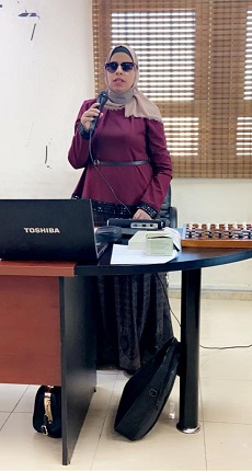 ثم قامت الدكتورة إسراء أبو كشك وهي من ذوي الإعاقة البصرية وأخصائية وناشطة في التربية الخاصة لتقديم محاضرتها التي وضحت فيها كيفية تحديها للإعاقة البصرية، وحصولها على درجة الدكتوراة بإصراها ودعم عائلتها لها ،كما وقدمت شرحًا موجزًا عن نشأة المركز السعودي للكفيفات والفئة المتسفيدة من خدماته والدورات المطروحة سواء كانت أكاديمية أو مهنية أو دورات متخصصة بالمكفوفين كدورة لغة بريل ودورة فن الحركة والتنقل، وغيرها من الدورات التي تصقل مهارات المكفوف لتمنحه الاستقلاليه في الحركة وتجعله يعتمد على نفسه في حياته اليومية وفي عمله.