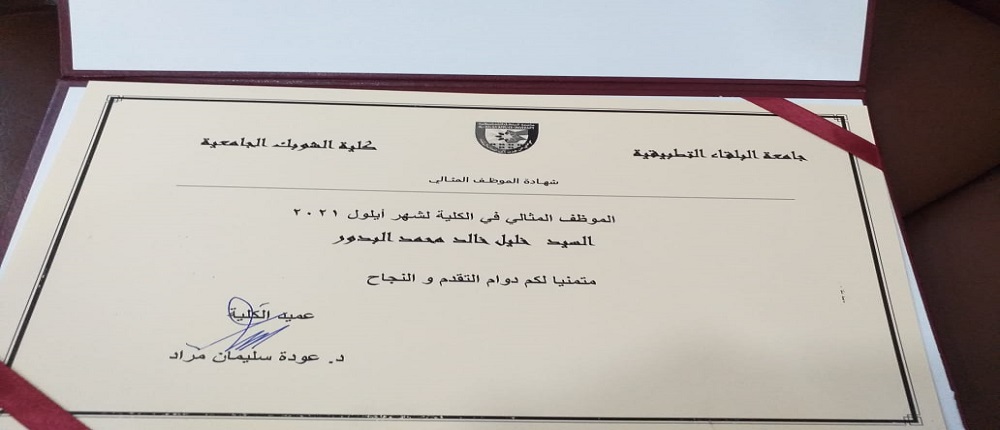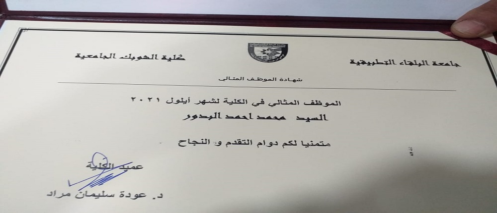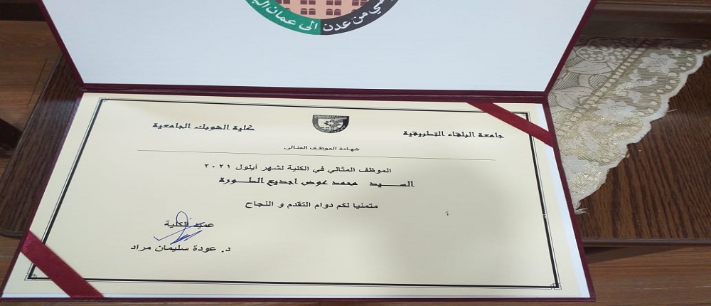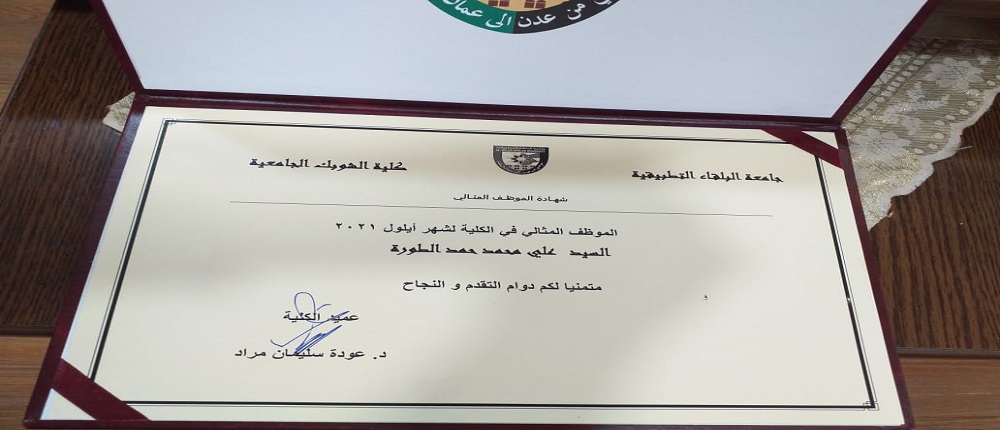 تقديرا لجهودهم " كلية الشوبك الجامعية تمنح شهادة الموظف المثالي " لعدد من الموظفين انسجامًا مع توجهات إدارة الجامعة ممثله برئيسها الاستاذ الدكتور عبدالله سرور الزعبي في تحسين الأداء والتطوير وتحفيز قيم التنافس البناء في العمل لدى الموظفين سلم عميد كلية الشوبك الجامعية الدكتور عوده مراد شهادة الموظف المثالي عن شهر ايلول 2021 للموظفين السيد محمد احمد البدور والسيد خليل خالد البدور والسيد علي محمد الطوره والسيد محمد عوض الطوره في الكلية تقديرا لجهودهم المخلصة وعطاءهم المتميز في تنفيذ الاعمال والواجبات المطلوبة منهم على أكمل وجه.