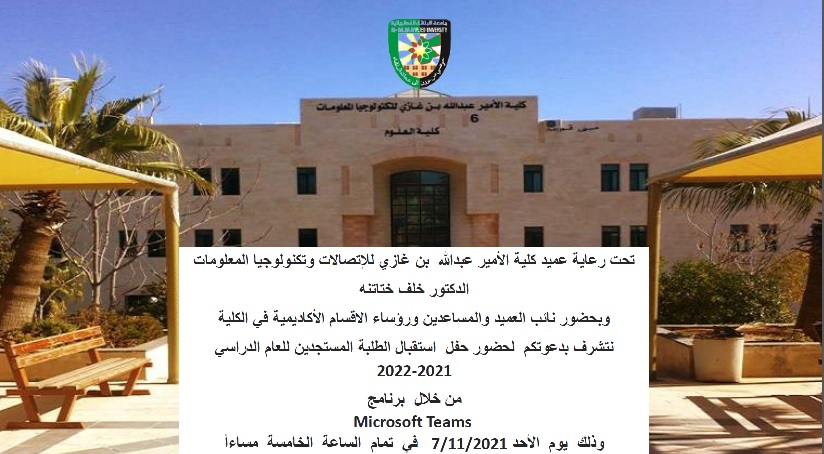 انطلاقا من حرص جامعة البلقاء التطبيقية وتوجيهات عطوفة رئيس الجامعة الاستاذ الدكتور عبدالله سرور الزعبي في التواصل الدائم مع الطلبة اقيم لقاء عميد كلية الأمير عبدالله بن غازي للإتصالات وتكنولوجيا المعلومات الدكتور خلف ختاتنة مع الطلبة المستجدين يوم الاحد الموافق 7/11/2021 مع طلبة في التخصصات علم الحاسوب،هندسة البرمجيات،نظم المعلومات الحاسوبية، الرسم الحاسوبي والرسوم المتحركة) بحضور نائب العميد والمساعدين ورؤساء الاقسام الاكاديميين .