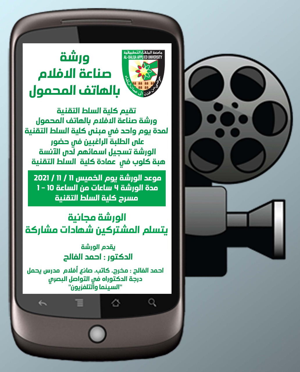 تنوي كلية السلط التقنية تنظيم ورشة عمل مجانية متخصصة بعنوان " صناعة الأفلام باستخدام الهاتف المحمول" وذلك في يوم الخميس 11/11/2012 يقدمها المخرج وصانع الأفلام الدكتور احمد الفالح.